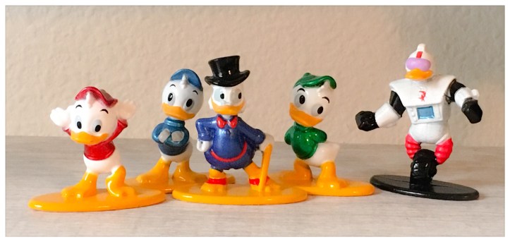 The best news is that DuckTales has representation in the Nano Metalfigs line in the Disney series of die cast figures. Scrooge McDuck and Gizmoduck are available in both single packs and multipacks. The 10 figure multipack also contains exclusive Huey, Dewey, and Louie die cast figures.