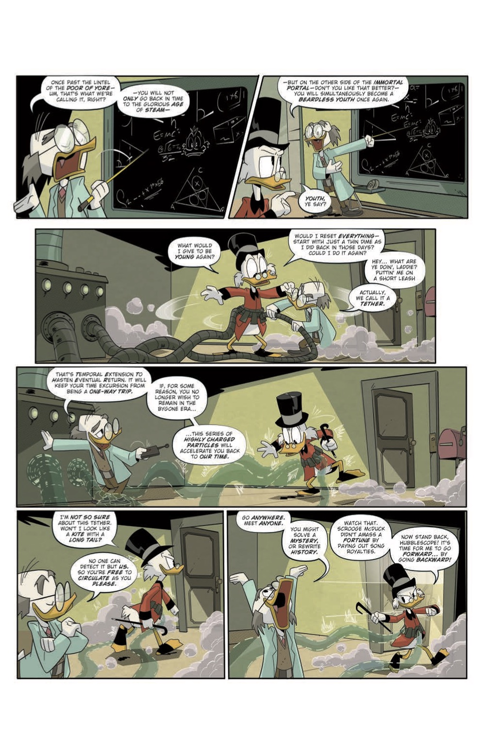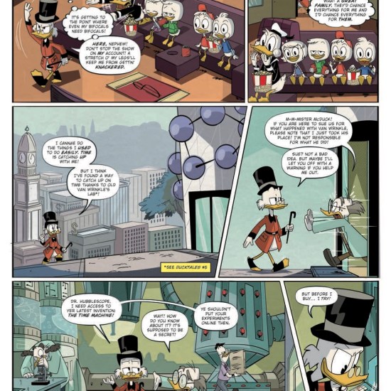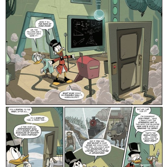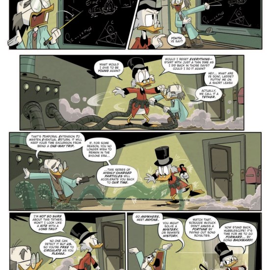 Story A tells another tale of Scrooge attempting to defy time. This time by traveling to his favorite time period. The issue opens with a great homage to the classic cartoon’s title sequence. I particularly enjoyed a gag about Scrooge refusing to pay royalties on a particular song that the reader should be familiar with.