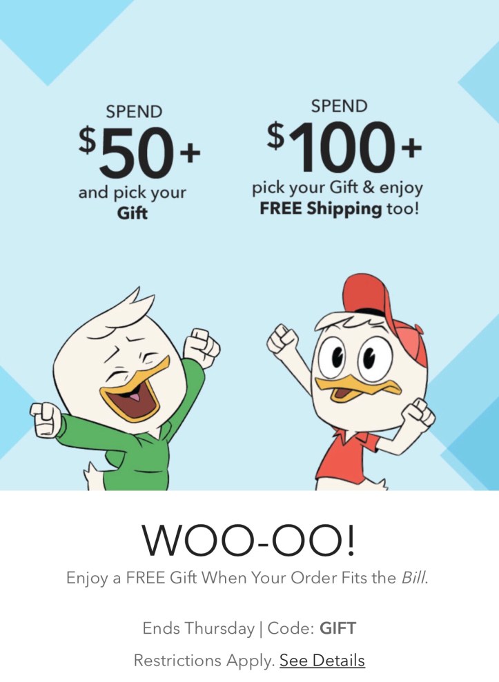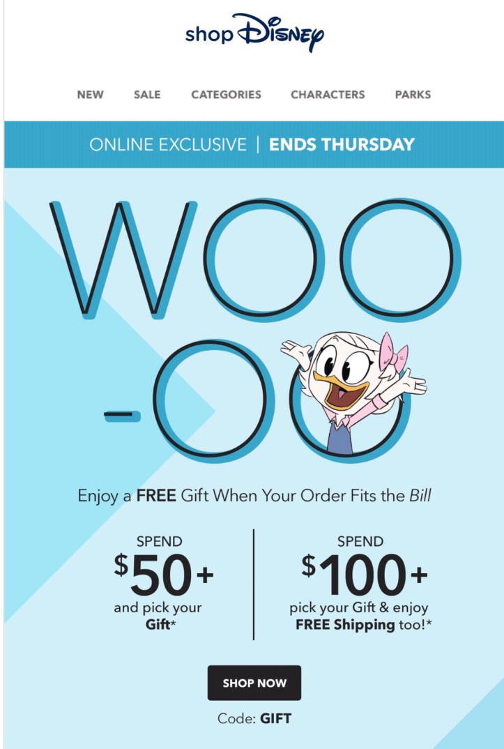 ShopDisney.com is advertising a free gift with a purchase of $50 or $100. The advertising includes images of the kids from DuckTales and the line “Enjoy A FREE Gift When Your Order Fits The Bill”