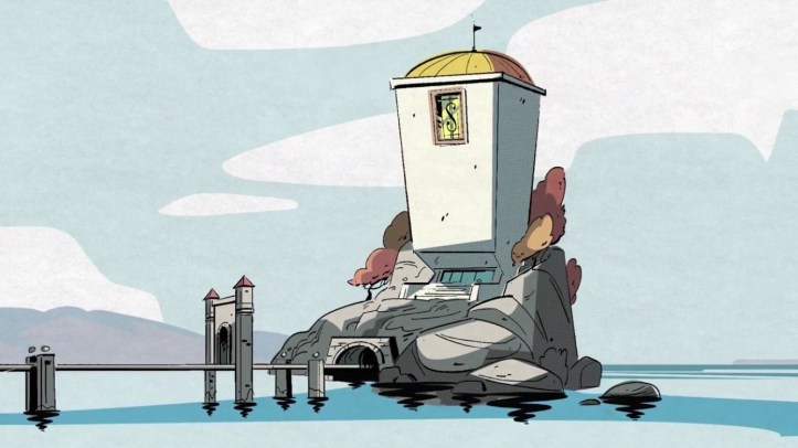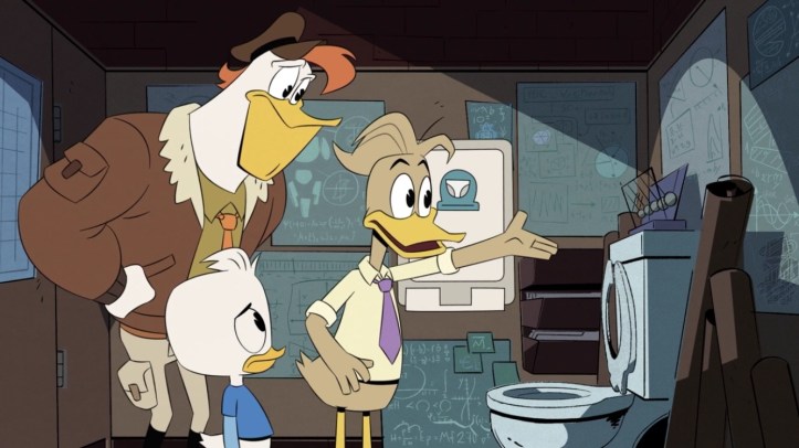 Fenton’s laboratory is indeed located in a bathroom in Gyro’s underwater lab.