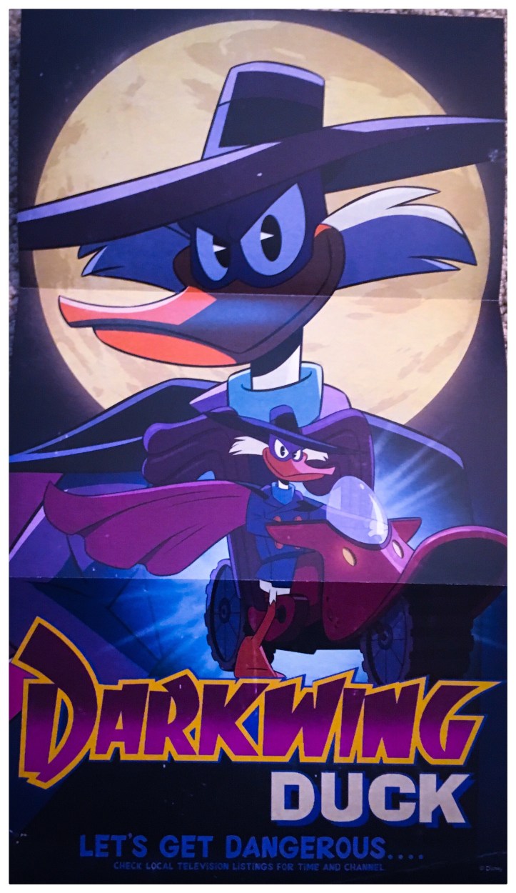We have what appears to be really cool in-universe video store ad for the Darkwing Duck videos that Launchpad and Dewey Duck are watching in the episode Beware the B.U.D.D.Y. System! We originally thought this was an announcement poster for a new Darkwing Duck show, but it was confirmed by Frank Angones to be an in-universe advertisement. Awesomely dangerous poster!