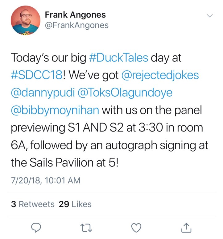 At 3:30 pm pst there will be a DuckTales Panel in room 6a. Matt and Frank will he joined by Ben Schwartz (Dewey), Bobby Moynihan (Louie), Danny Pudi (Huey), and Toks Olagundoye (Mrs. Beakley). We’ve seen reports that there will be discussion on the mystery surrounding Della Duck, Season 2 Adventures, and footage from never before seen episodes! Earlier Frank was on Twitter and this is what he had to say.