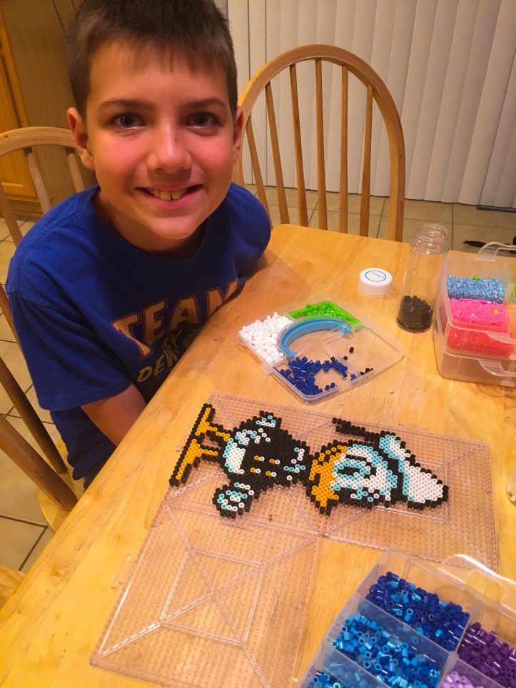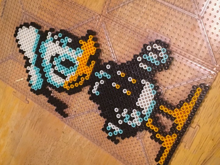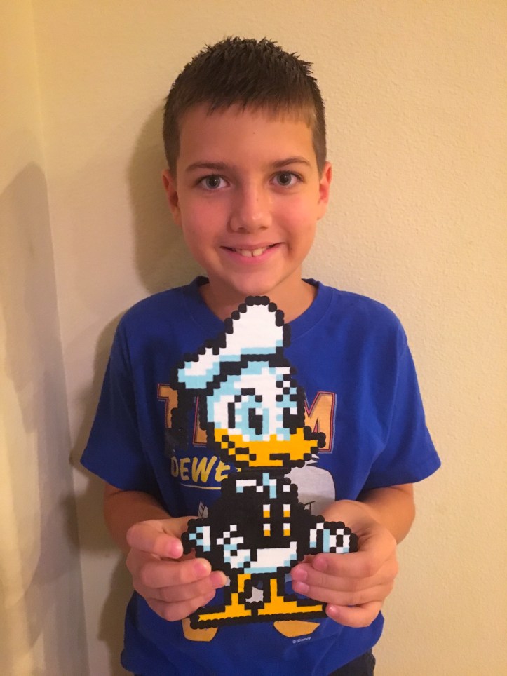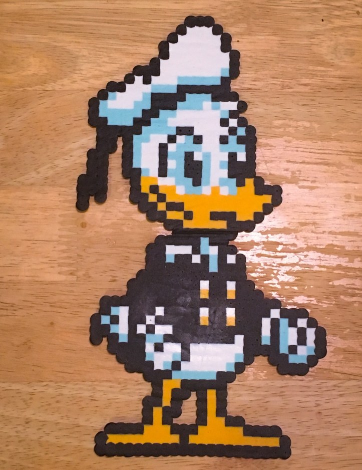 Brandon of course wanted to try to overachieve and recreate all of the characters in Perler Bead form today. He finally decided to make Donald Duck.