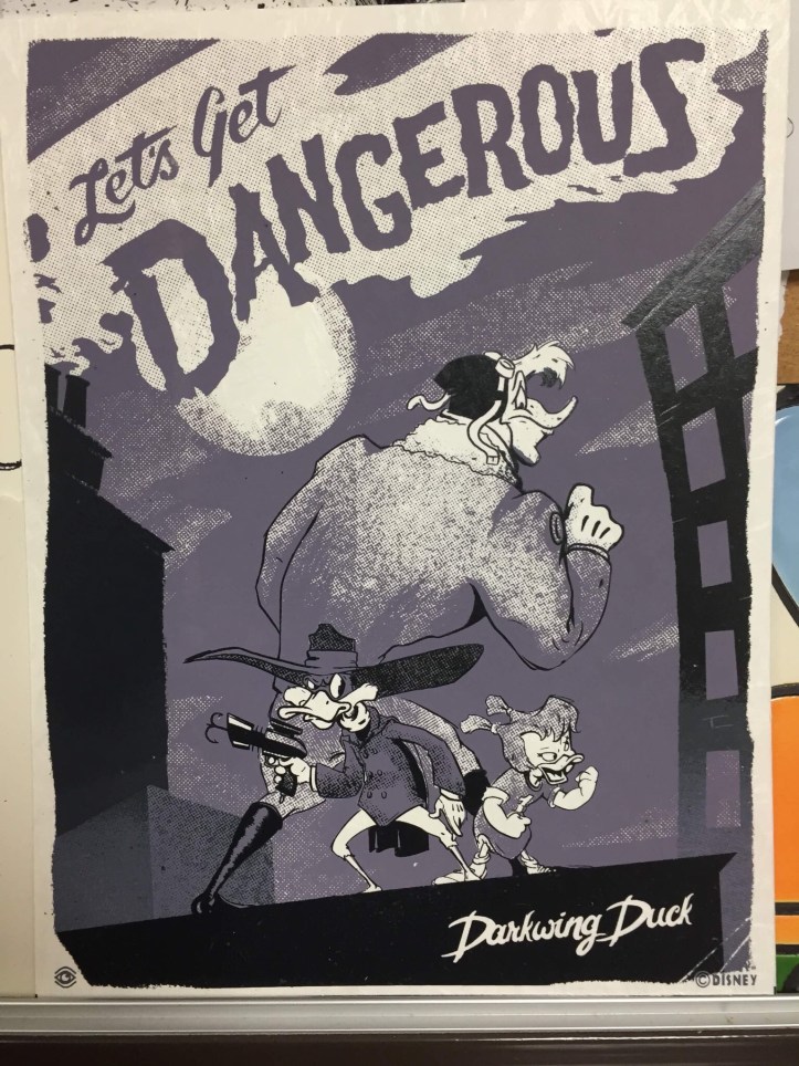 The second print is a Darkwing Duck print by Ben Brick featuring Darkwing Duck, Launchpad McQuack, and Gosalyn Mallard.