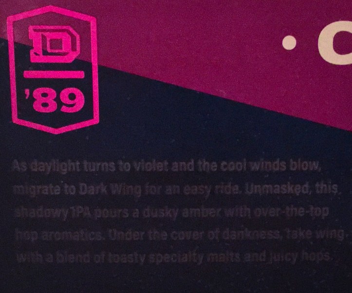 The Darkwingesque message on the six pack carton reads: As daylight turns to violet and the cool winds blow, migrate to Dark Wing for an easy ride. Unmasked, this shadowy IPA pours a dusky amber with over-the-top aromatics. Under the cover of dankness, take wing with a blend of toasty specialty malts and juicy hops.