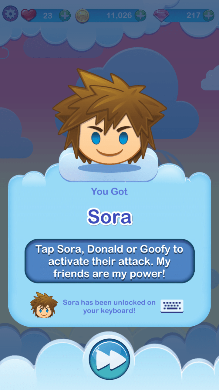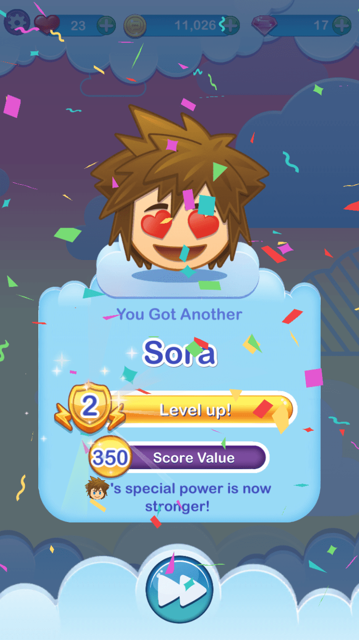 I received another Sora in the diamond box that I collected for finishing the event. If you unlock an exclusive diamond box emoji, you have the opportunity to get that emoji in Gold boxes that can be purchased for 30,000 coins. Coins can be earned in the game or purchased with real currency. I luckily got Sora in a gold box which boosted my Sora emoji to a level 3 with more emoji clearing powers with Sora’s special move.