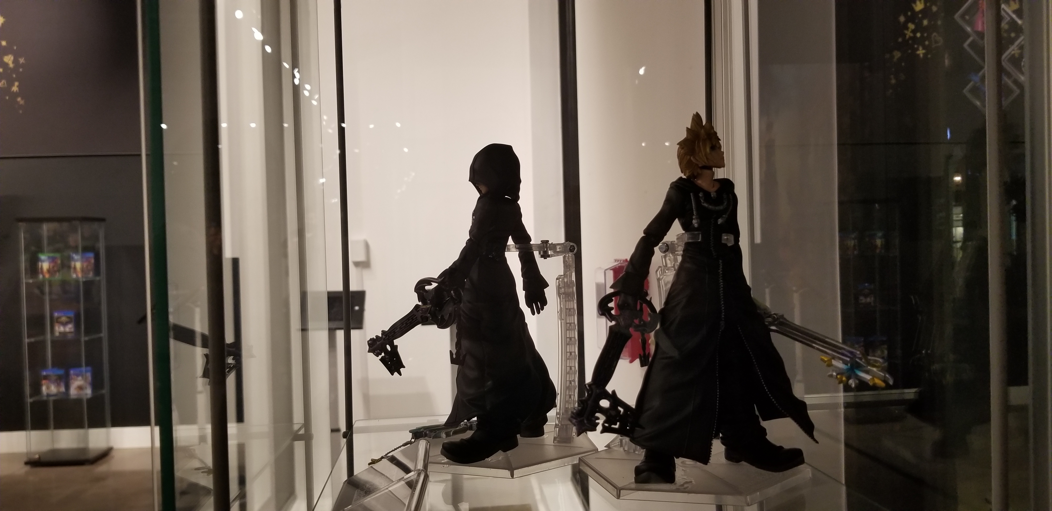 There was even life size replica keyblades on display, like Sora’s original keyblade or the new Infinity Badge keyblade (that will be received in the Toy Box world which features the characters from Toy Story). Also, on display was thePlay Arts figures previously released or yet to be released. The figure of Aqua was very excellent, and I know in the future that this figure will be added to my collection. They had the game cases for Kingdom Hearts III both PS4 and Xbox One on display. Only the standard version of each game, none of thecollector/limited edition versions were displayed.