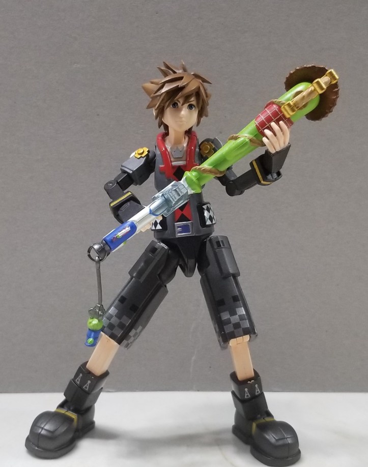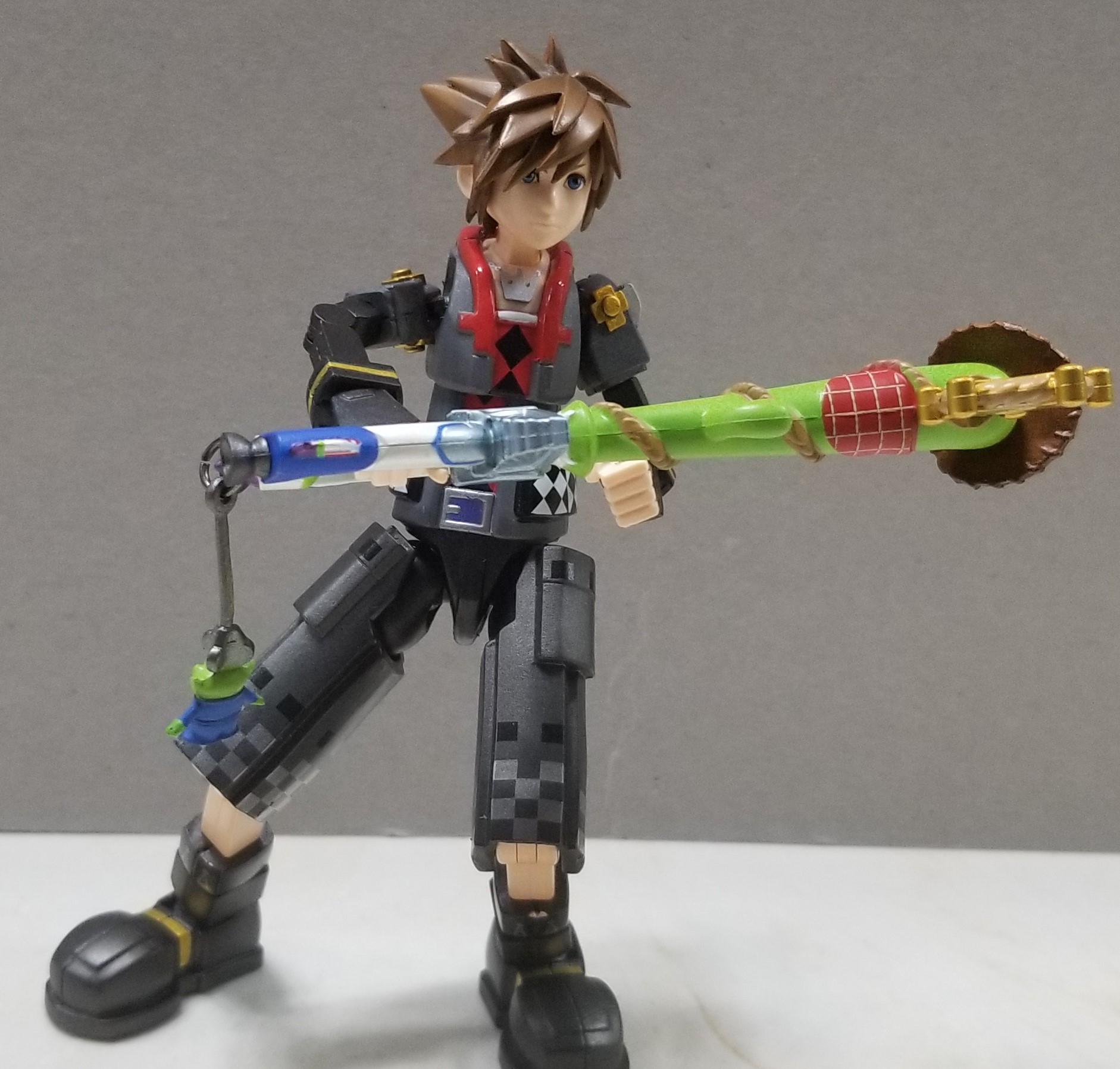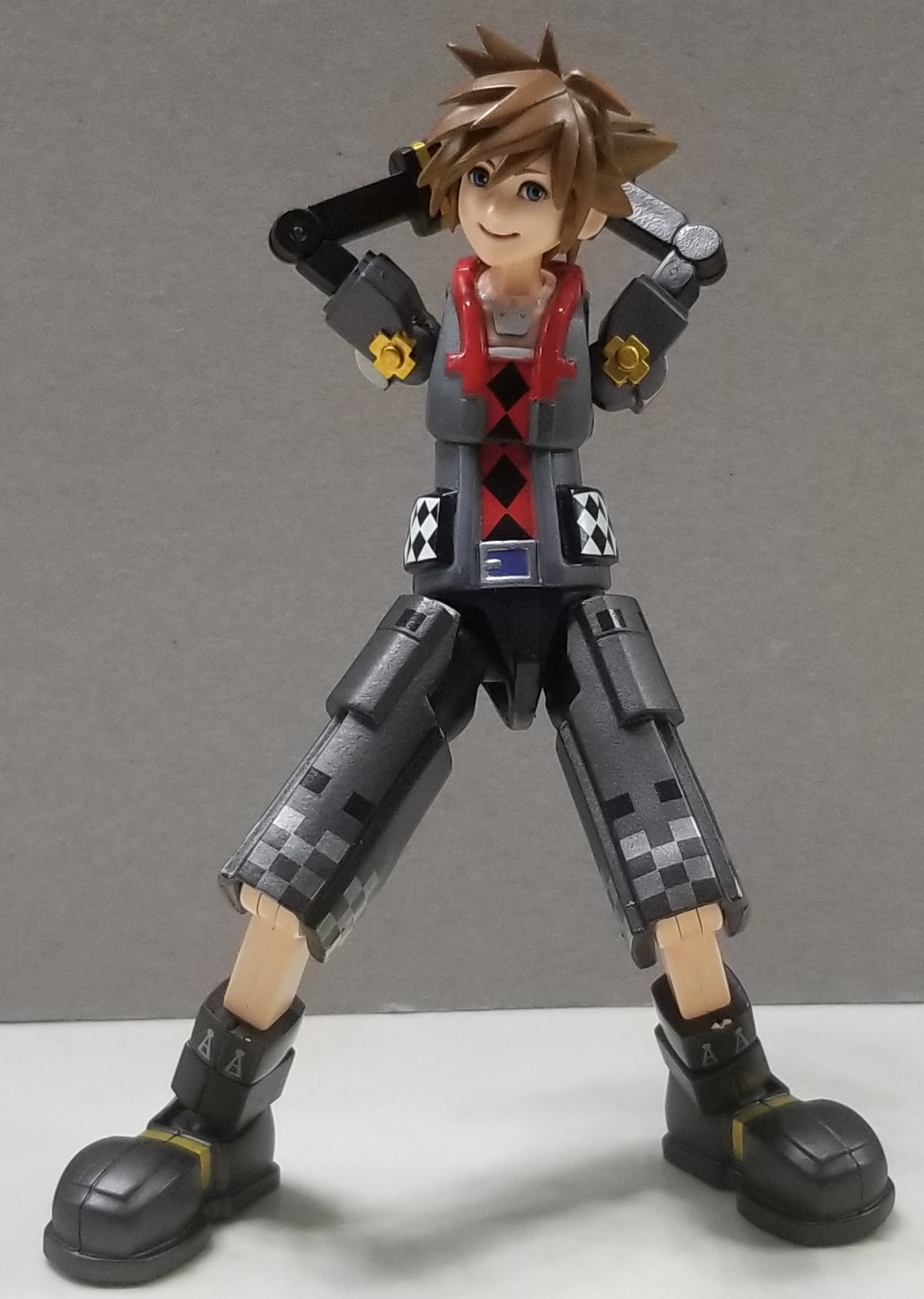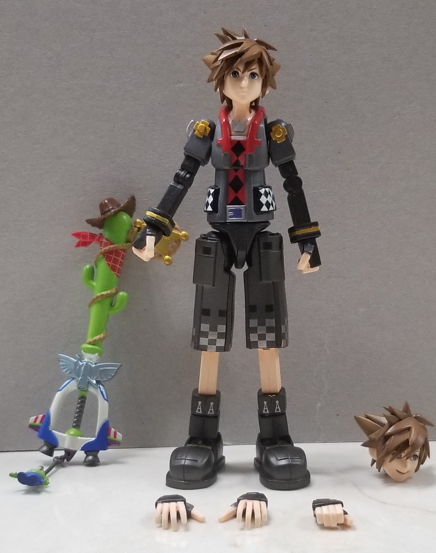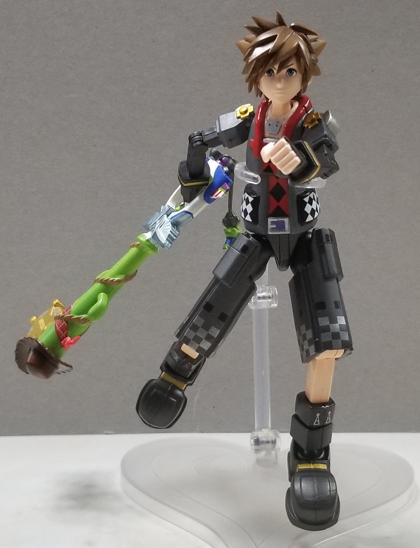 Sora has great articulation. He also has two different heads, one for a more serious tone and the other for a happier, lighter tone as Sora smiles. Both can be used for great poses.