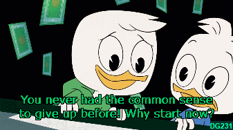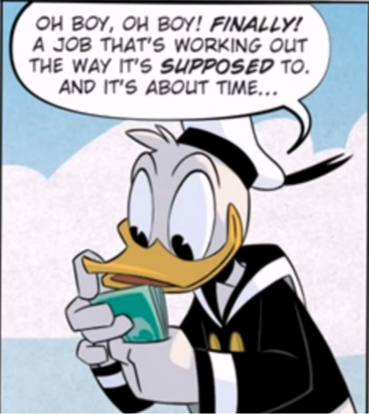 Instead, younger Louie misinterpreted his uncle’s rotten luck as the futility of hard work – a lesson Scrooge has been trying to have Louie unlearn since he met him. Louie clearly saw his Uncle Donald working hard and for very little reward. If Uncle Donald was busting his tail feathers at all these jobs and still had to skip meals… what was the point of hard work?