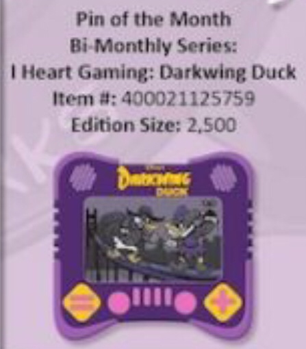 The Darkwing Duck I Heart Gaming pin will be released exclusively at Disneyland Resort on May 30th. This pin will be a limited edition of 2500 and retail for $17.99. The game screen on this pin is lenticular.