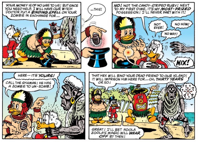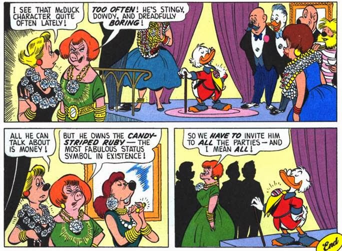 In a 1963 comic by Carl Barks titled The Status Seeker, Scrooge is able to get the Candy-Striped Ruby back from the Chief of Rippan Taro. Having the Candy-Striped Ruby in his possession gives him the ultimate status at all of the millionaire clubs.