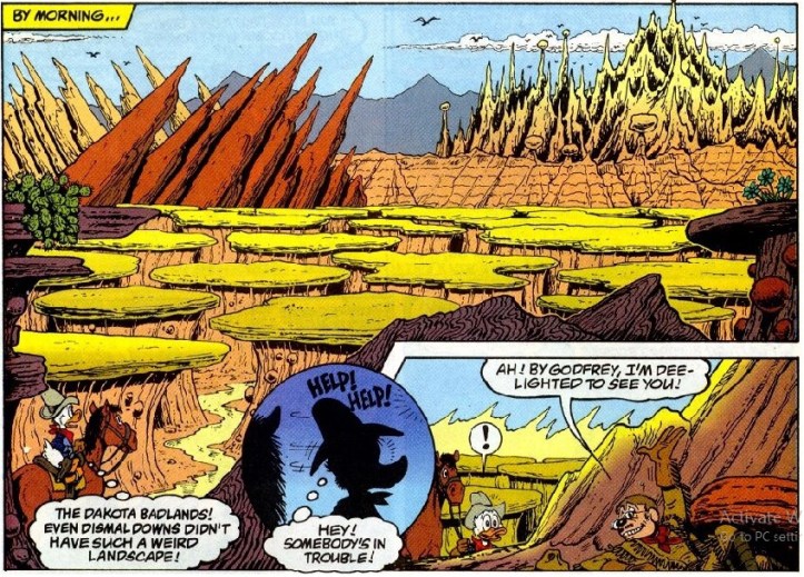 “The Buckaroo of the Badlands” was the third story of Don Rosa’s 12 chartered story of Scrooge McDuck’s life. It takes place after Scrooge has left his home in Scotland after being inspired by his Number One Dime, and sailed the Mighty Mississippi River as the Captain of his own riverboat. At the age of fifteen, Scrooge has taken a train to find his fortune in the Wild West.