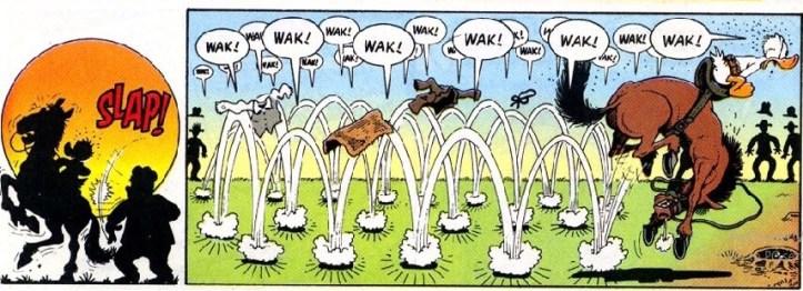 This was one of my favorite stories of the series. Carl Bark’s was a huge fan of westerns and Don Rosa’s stories of Scrooge as a Cowboy are definitively appropriate. Some of the events from this story will go on to influence big moments in his life later (square eggs, learning to rope and ride, saving a future president).