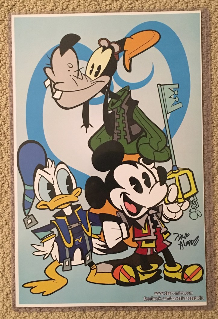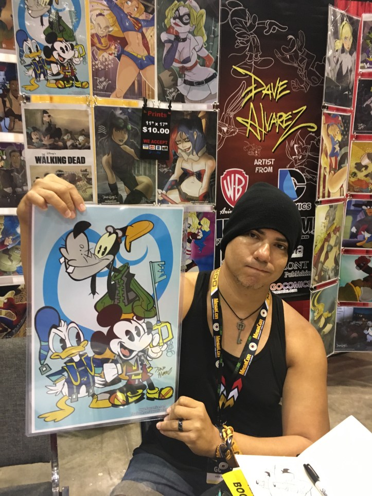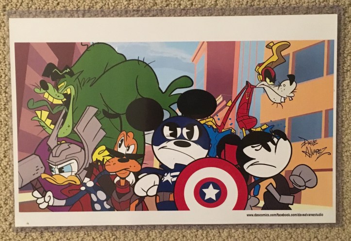 David’s booth is full of prints which he was selling as well as comics and commissions, and original art. Some of the prints of immediate interest included an image of Darkwing Duck and the Duck Avenger and a print of Gizmoduck, Scrooge McDuck, Huey, Dewey, and Louie fighting the Beagle Boys. My family love the new Mickey Mouse shorts art style. So I purchased a Kingdom Hearts print and an Avengers pint in that art style for my kids.