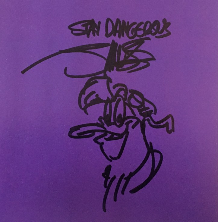 Also available at the James Silvani booth are Darkwing Duck Trade Paperbacks, James’ book Draw-A-Saurus, character head shots ($20), and original full body art ($80). I brought my two Darkwing Duck trade paperbacks and the Darkwing Duck bible Darkwing Duck: The Definitively Dangerous Edition from home, and James was nice enough to sign and sketch in my books.