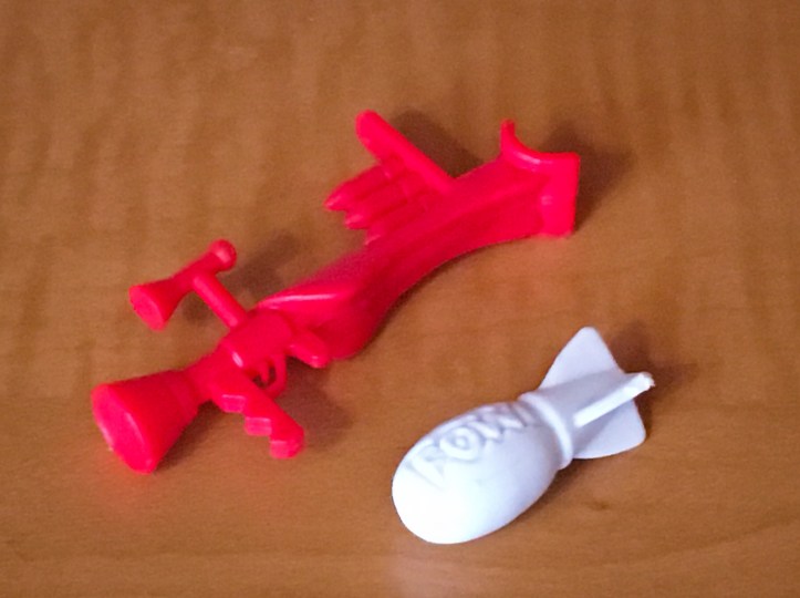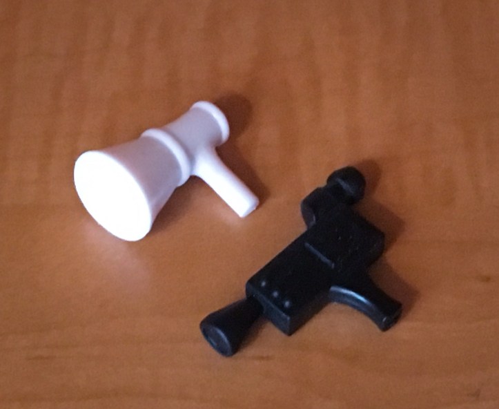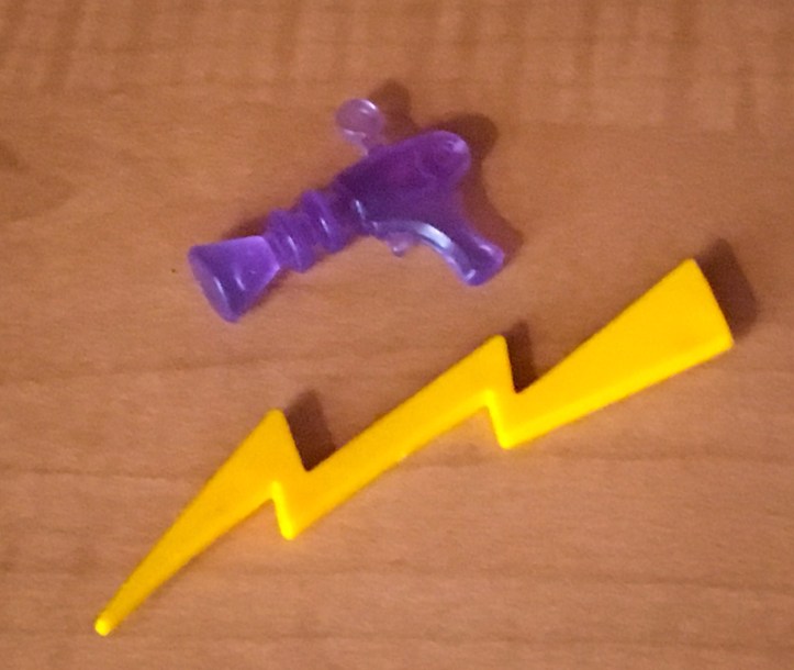 This is such an interesting action figure. The wheel switches on the back of Megavolt is from cigarette lighter technology and will create a spark from Megavolt’s plug on the front of the figure. I don’t know how this passed toy safe inspections, but I love it and it still works on my figure. Megavolt comes with the following accessories of which he is not able to hold either of them.