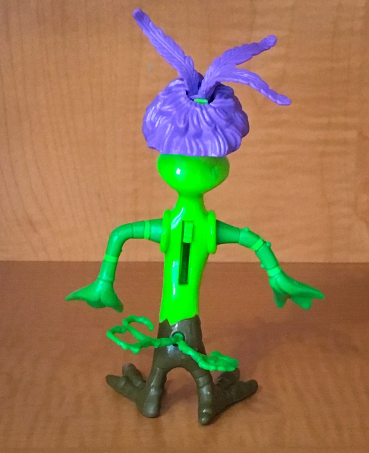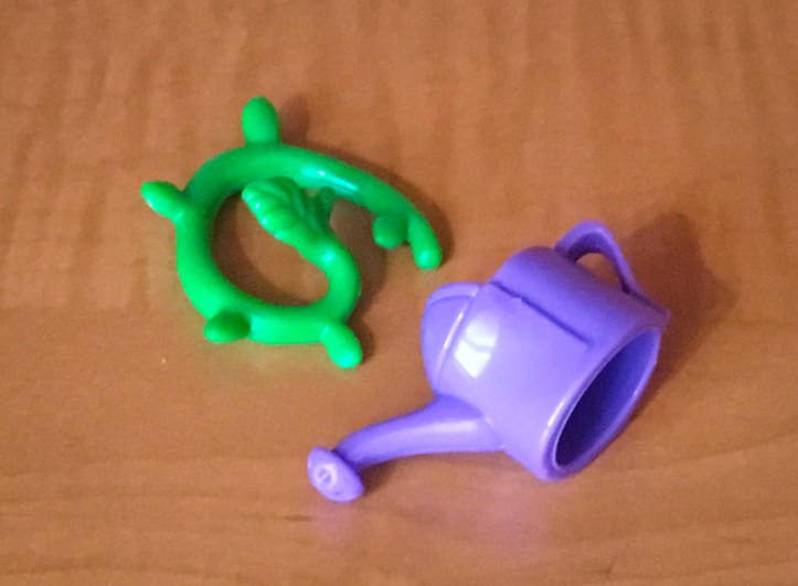 The lever on Bushroot’s back makes his purple hair grow when you push it down. Bushroot comes with the following accessories of which he is able to have the vines wrapped around him, but he is not able to hold the watering can.