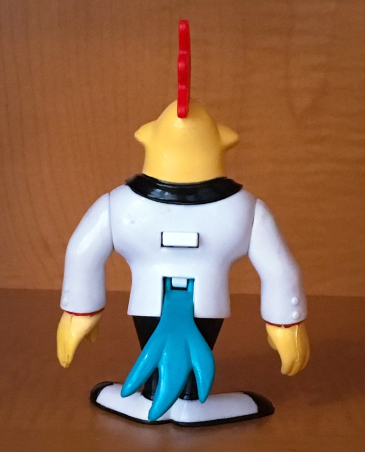 The button on Steelbeak’s back opens and closes his mouth and moves his tail feathers up and down. Steelbeak comes with the following accessories of which he is not able to hold either of them.