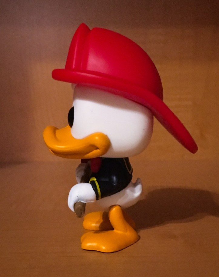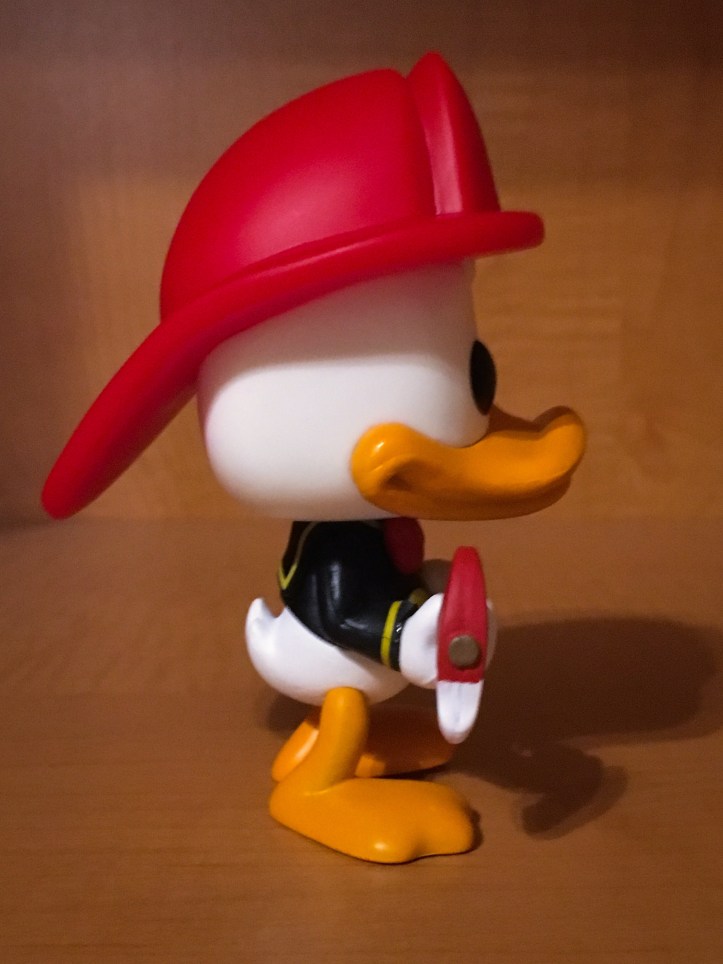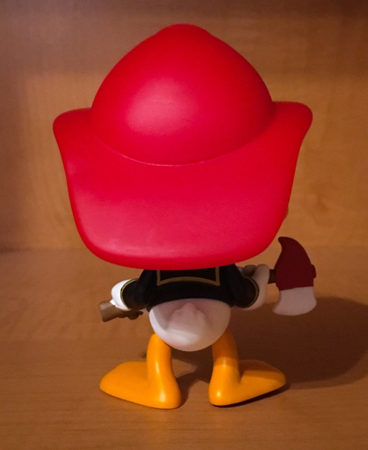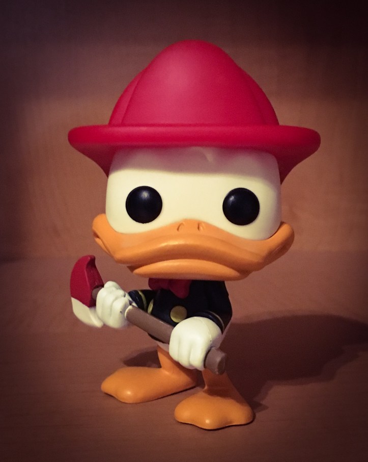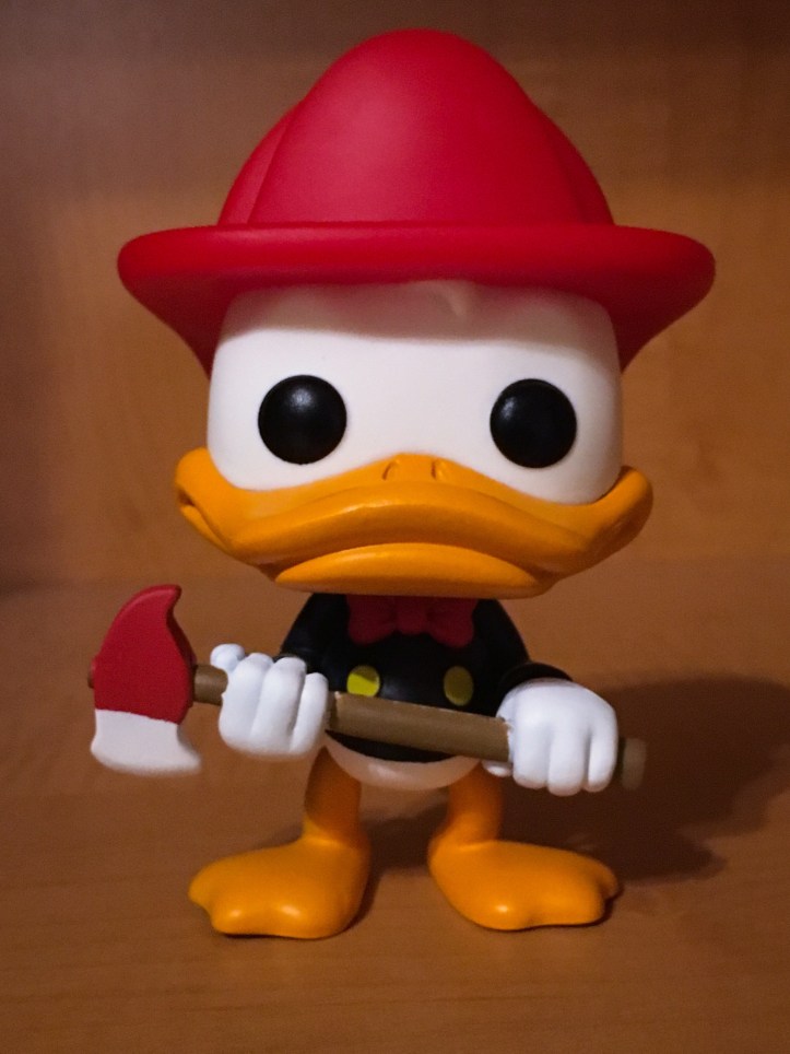 Donald Duck has appeared as a firefighter in a few Classic Disney animated shorts, but this figure is from Carl Bark’s Fireman Donald Story first appeared in Walt Disney’s Comics and Stories #86 (November 1947). In this story, Donald Duck becomes a volunteer firefighter in Fireman Donald. He starts off in a role as the first hoseman on the ladder truck, and he gets demoted several times for being late to the fire or for making mistakes.