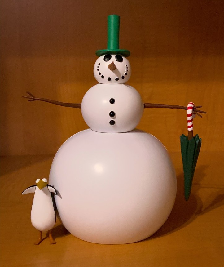 The alternate snowman head sculpt and twig arms can be swapped out with the Jack Skellington figure pieces to build the Christmastown snowman. The Christmastown umbrella completes the look. A penguin is included to add to your display.