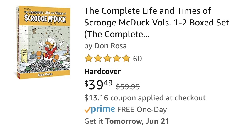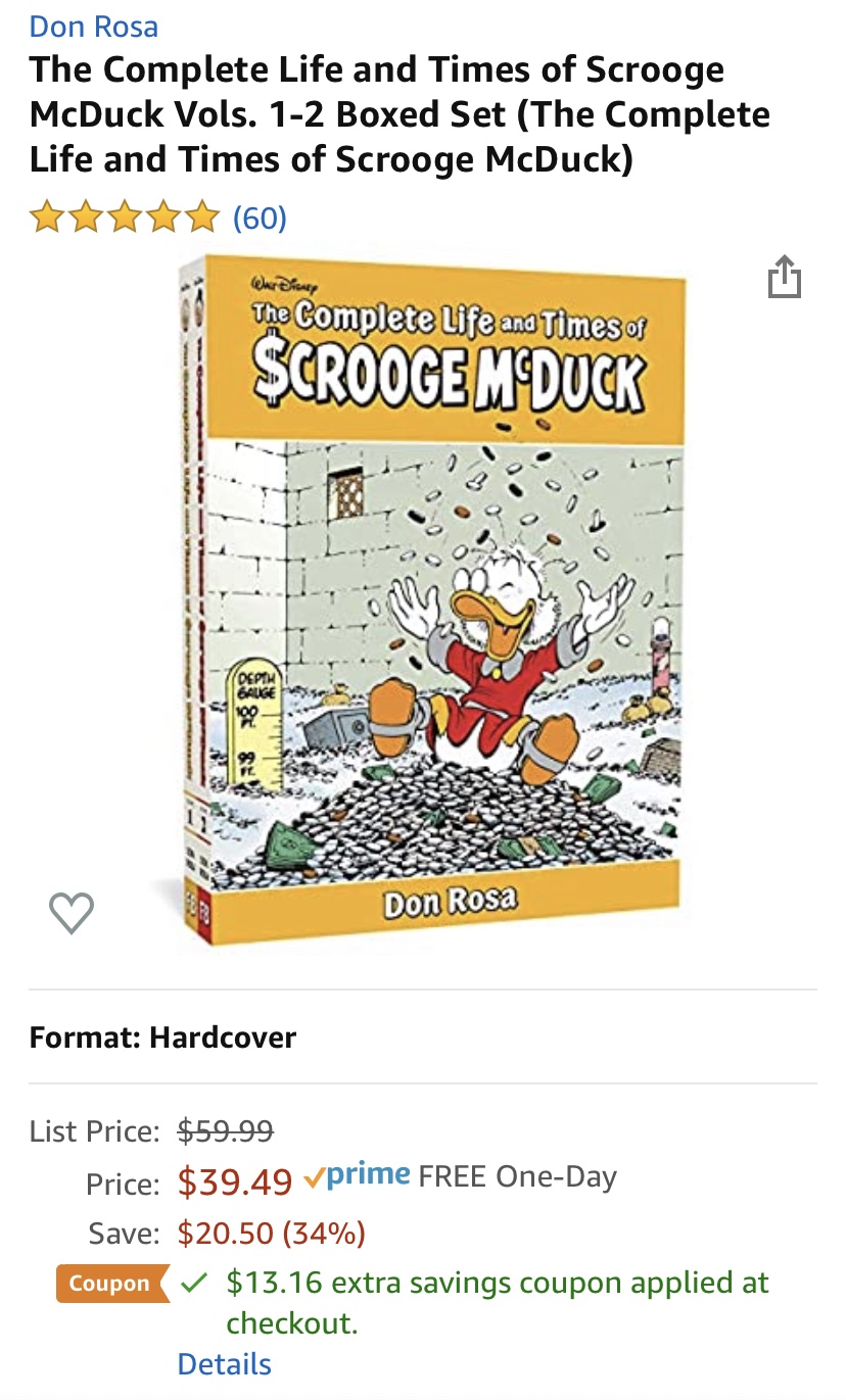 There is currently am amazing coupon on Amazon that can be clipped to save an additional $13.16 off of the already discounted price of Don Rosa’s The Complete Life and Times of Scrooge McDuck Vol. 1-2 Box Set. Both volumes for under $30 with a nice slip cover.