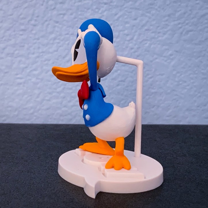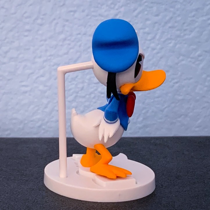 Donald has pegs on the bottom of his feet so you will need to use the accompanying stand to display him.