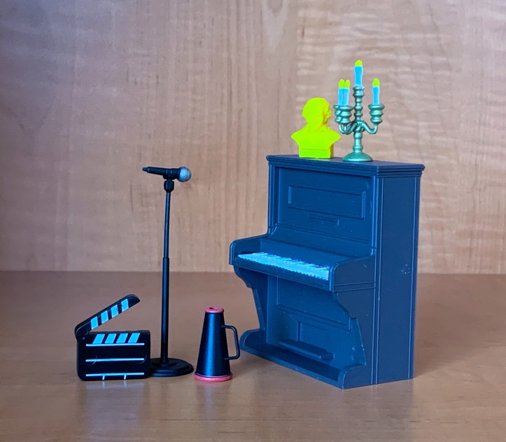 Accesories include: detachable microphone and microphone stand, megaphone, clapboard, Beethoven bust, candelabra, and piano.