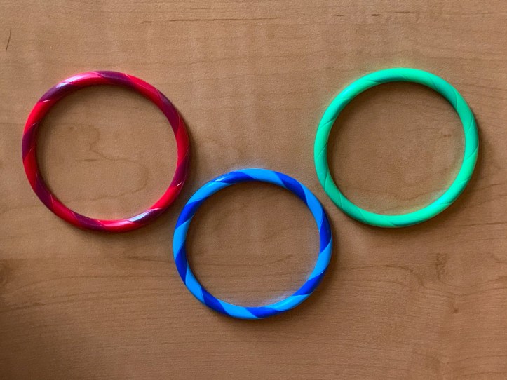 Here are the hula hoops that come with Huey, Dewey, and Louie. Each hula hoop fits securely in the figure’s hands. It is recommended to soften the hands of the characters before placing the hula hoops in their hands. Instructions for softening the hands are included in the box.