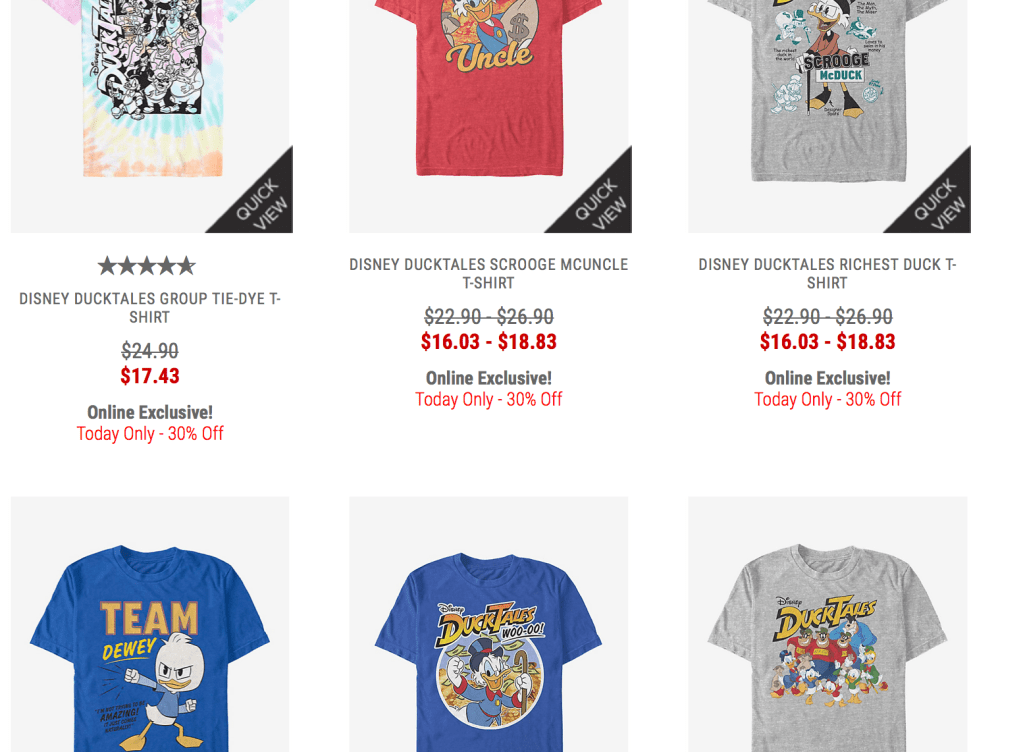 I just happened to see an ad for a sale going on today only for 30% off merchandise at Hot Topic. I grabbed a cool DuckTales and Darkwing Duck shirt on the sale. Oh, and if you have a local store you can do FREE Ship To Store on many products!