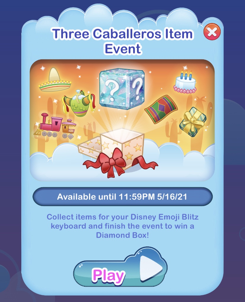Upon completing the event, you will earn a diamond box where you will have a chance to unlock one of the Three Caballeros emojis. During the event, you will unlock additional Three Caballero related item emojis. You can also purchase a diamond box in game for 200 gems which you can pay for with real money or earn in game.