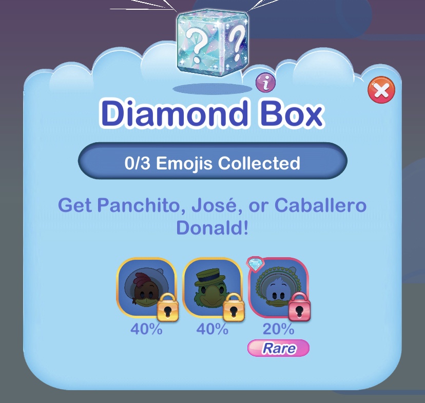 Unfortunately, I will not be able to unlock the Caballero Donald Duck emoji which is only available as part of this event unless I purchase an additional Diamond Box. I hope that he will be available again at a future event.