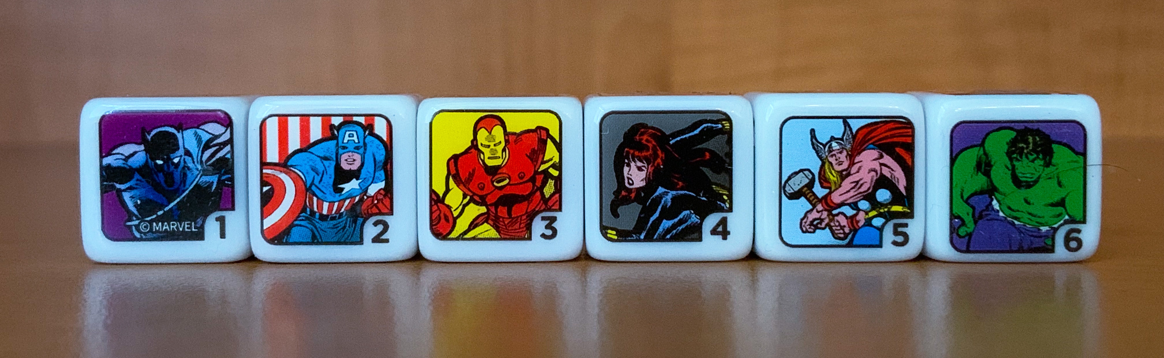 The Marvel Avengers dice set assembles the following heroes: Black Panther (1), Captain America (2), Iron Man (3), Black Widow (4), Thor (5), Hulk (6).