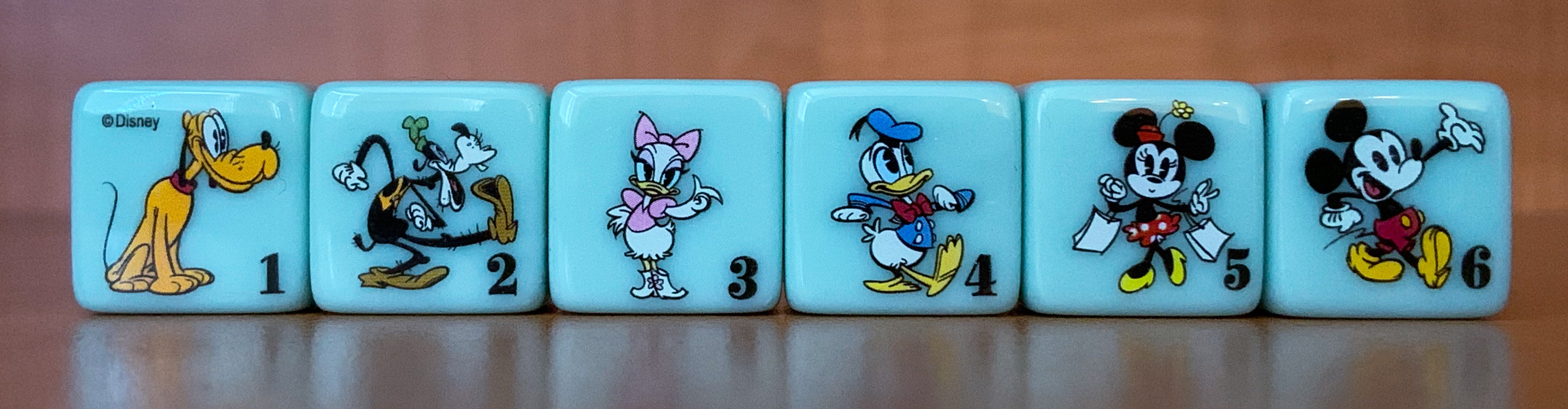 The Mickey and Friends dice set features Pluto (1), Goofy (2), Daisy Duck (3), Donald Duck (4), Minnie Mouse (5), and Mickey Mouse (6).