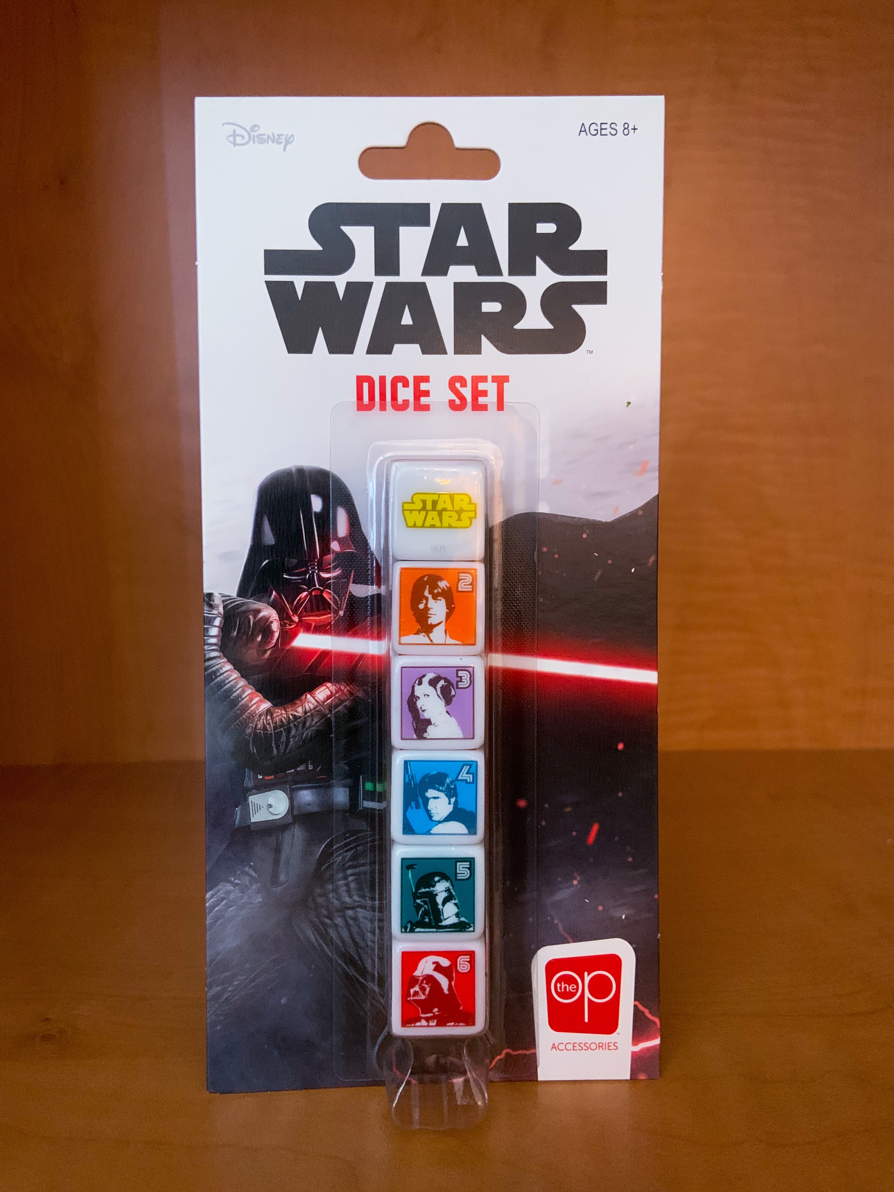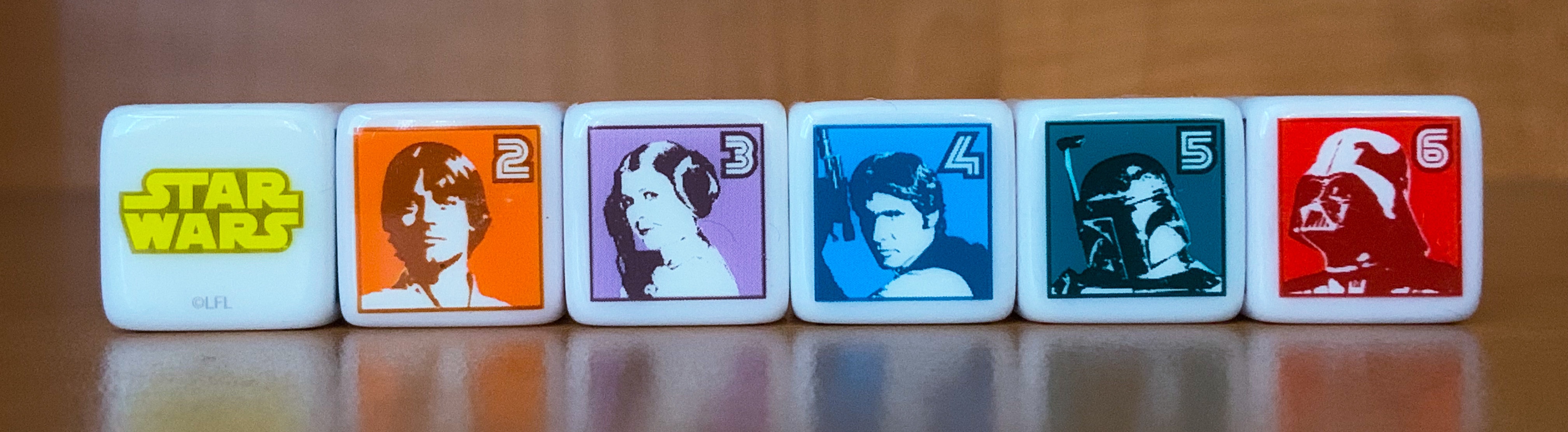 The Star Wars dice set features characters from the original trilogy: Star Wars Logo (1), Luke Skywalker (2), Princess Leia (3), Han Solo (4), Boba Fett (5), Darth Vader (6).
