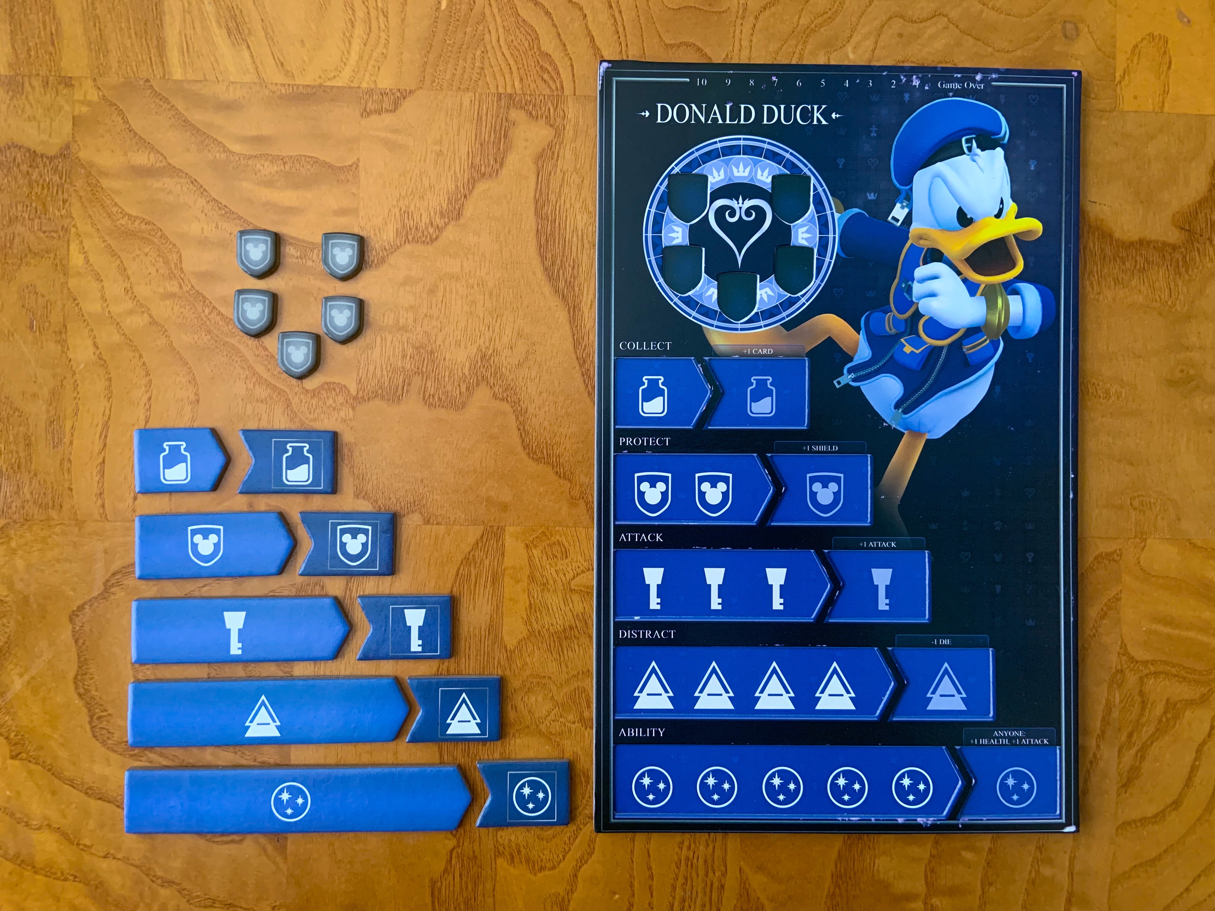 Below is a closer look at the Donald Duck player board. Each player board has five abilities that can be used throughout the game. Donald has the following abilities: Collect, Protect, Attack, Distract, and Ability. There is a health meter at the top of his card as well as shield spaces. If a player has shields on their player card, they can choose to lose a shield for an attack instead of losing health.