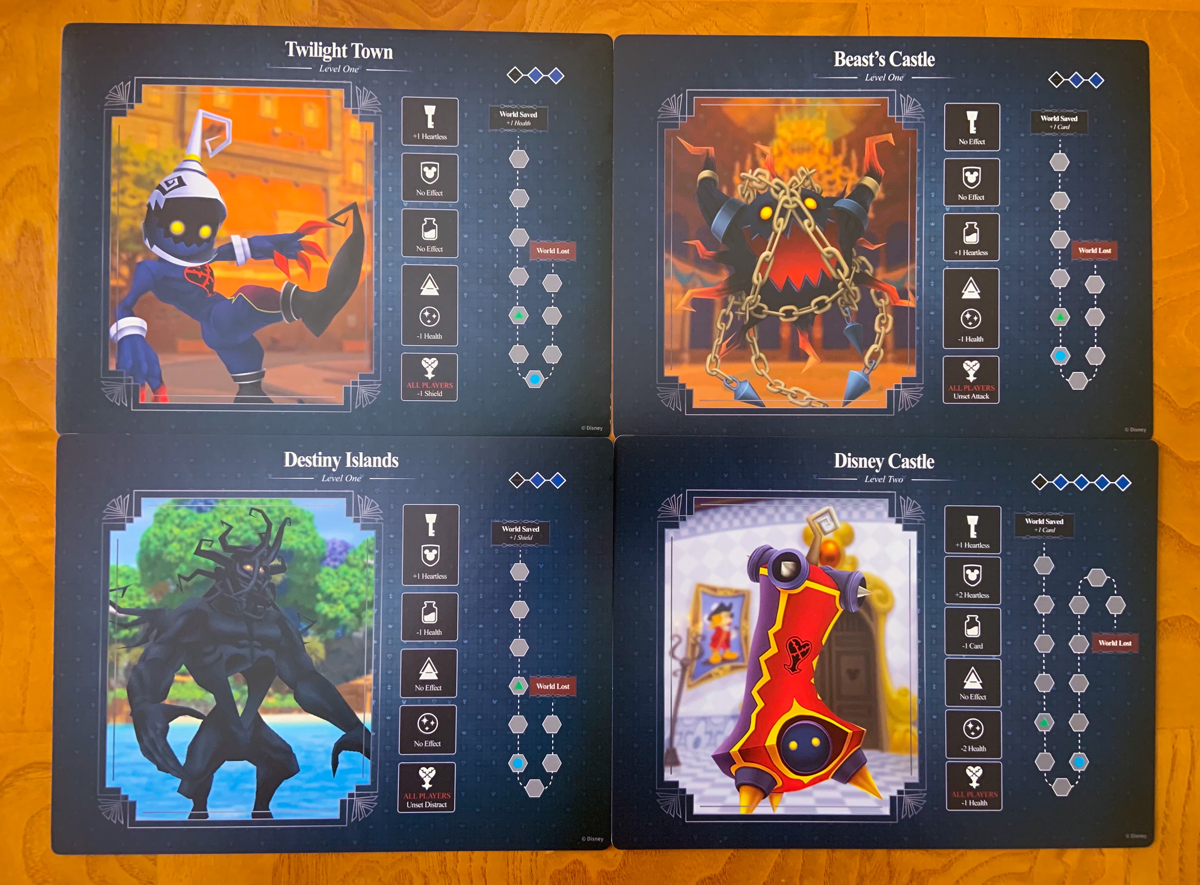 The game comes with 14 double-sided World cards representing different worlds from Kingdom Hearts I-III. You will randomly choose six world cards at the beginning of the game to save (1 Level One World, 2 Level Two Worlds, and 3 Level Three Worlds). Each World card features a unique capture track to follow to save the world from the Heartless.