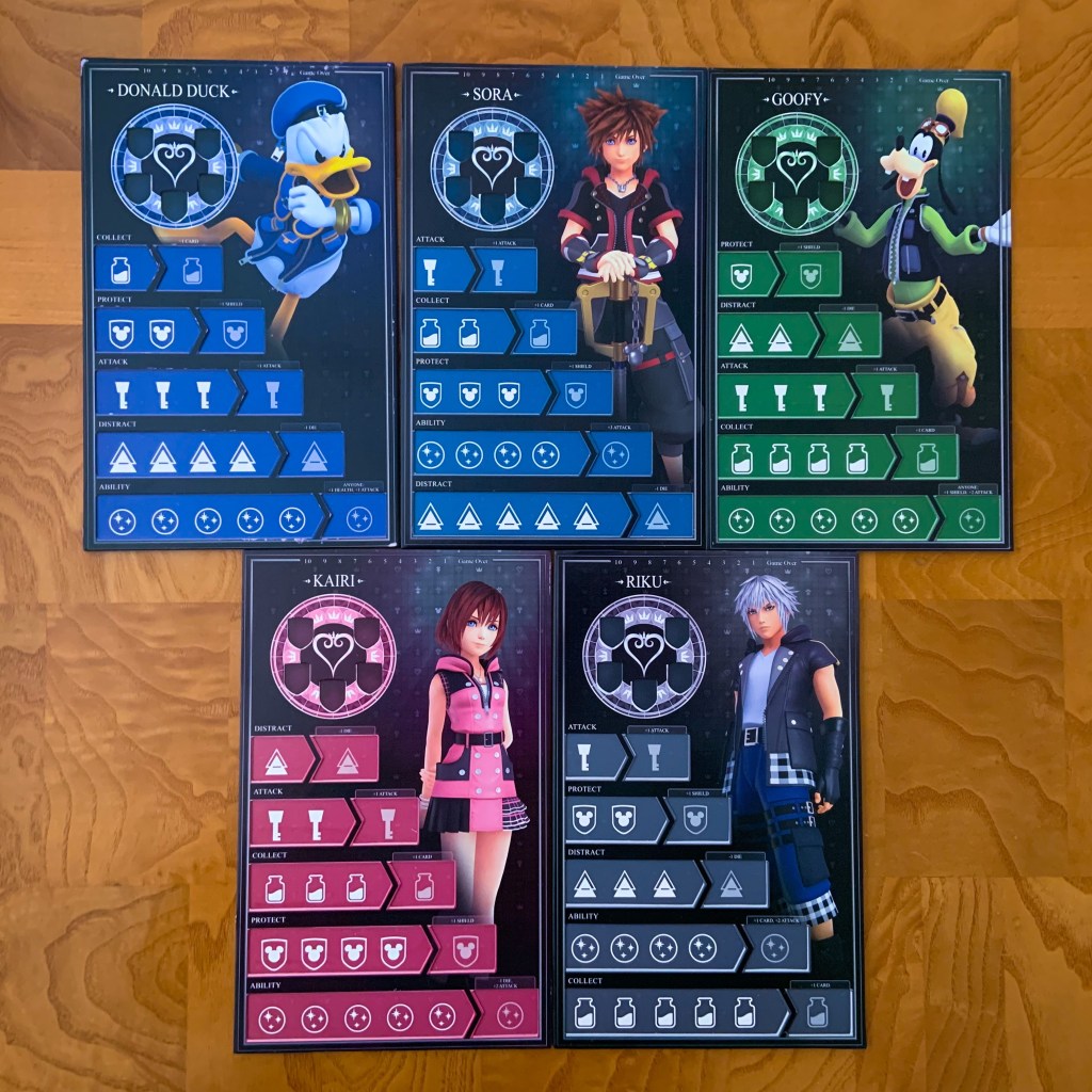 There are five player boards for the Kingdom Hearts characters that you may choose to play as in this game: Donald Duck, Sora, Goofy, Kairi, and Riku. Each character has their own special abilities and powers.
