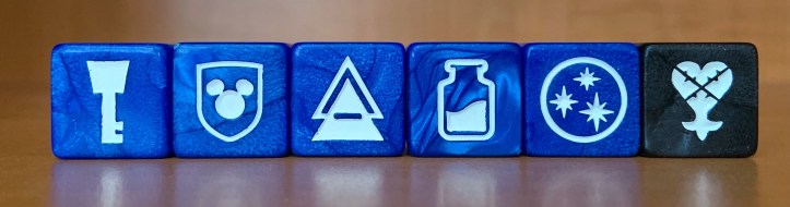 The symbols on the dice from left to right represent: Attack, Protect, Distract, Collect, Ability, and Heartless. There is also a crown side of the dice that acts as a wild.