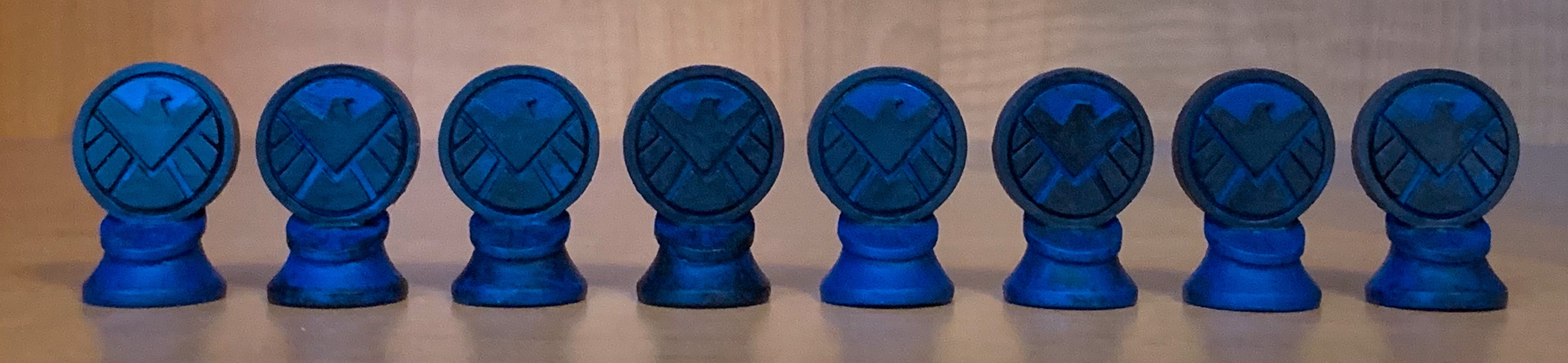 The Marvel Heroes Pawns are themed with the Agents of S.H.I.E.L.D. logo.