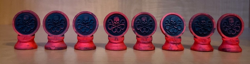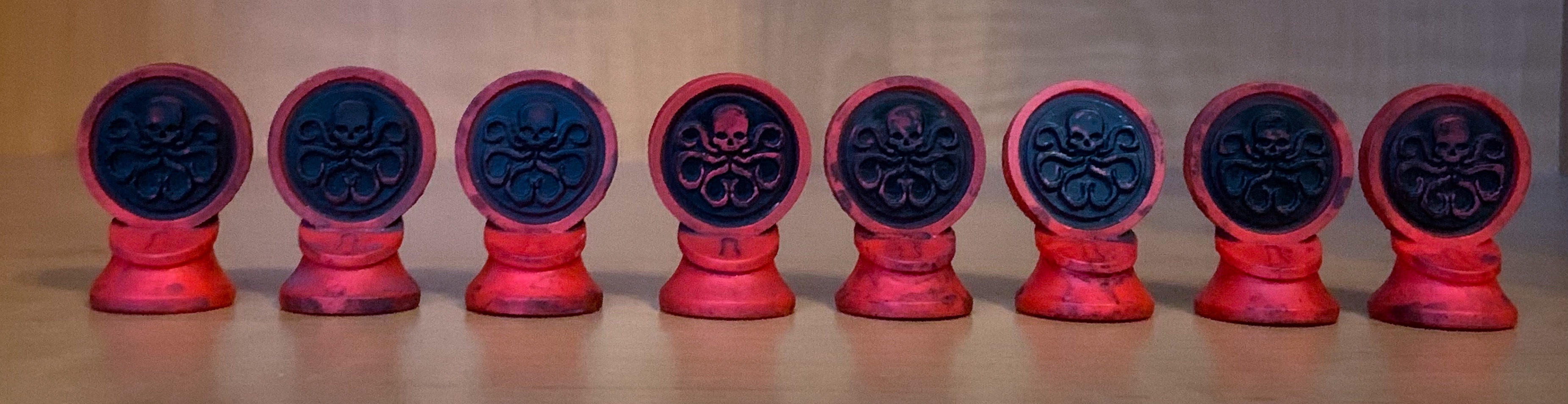 The Marvel Villains Pawns are themed with the Hydra logo.