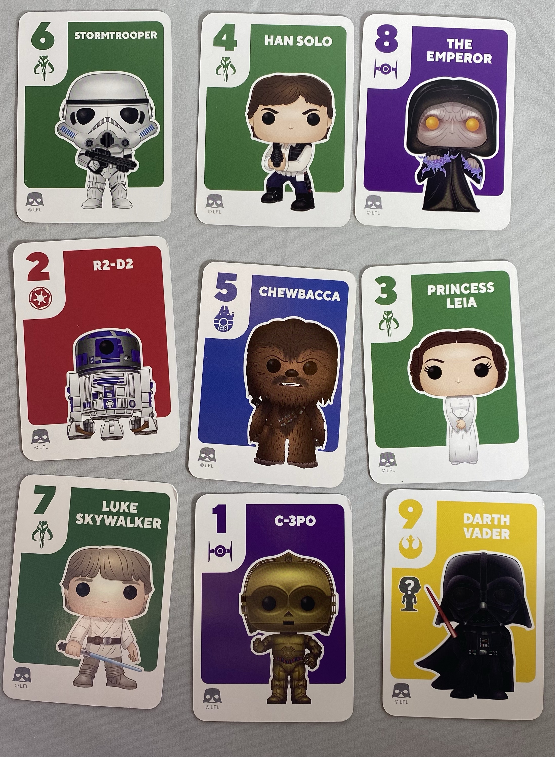 The cards include most of your Original Trilogy favorites. Luke, Han, and Leia are of course in the set. There are also cards for Chewie, R2-D2, C-3PO, Vader, a Stormtrooper, and the Emperor. The back of the cards have a cool color design with iconic Star Wars emblems that represent the colors used in the game. There are 45 Character Cards, 10 Power Cards, and the one mini Pop! figure.
