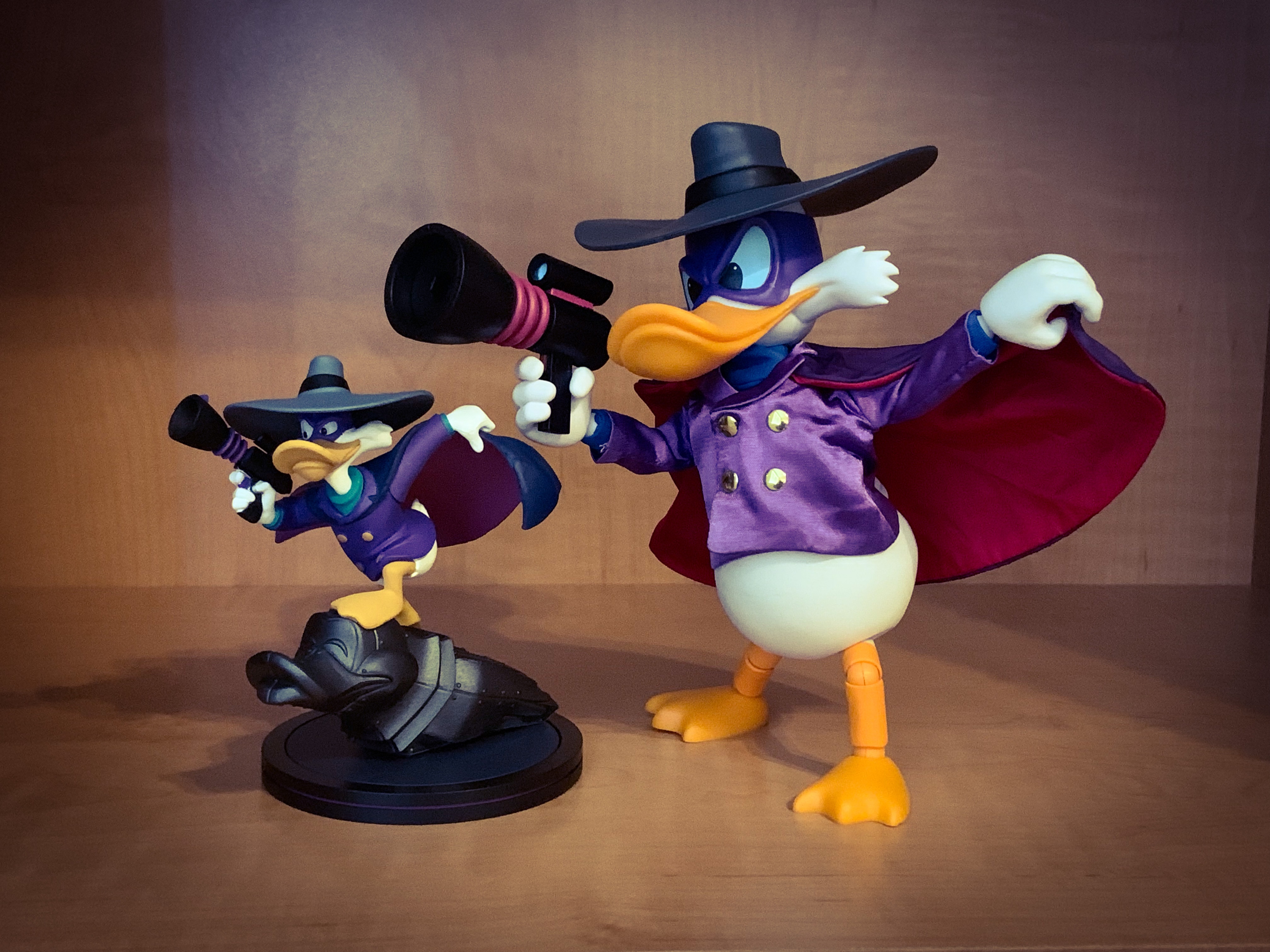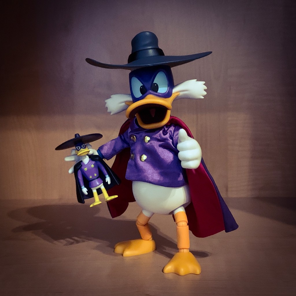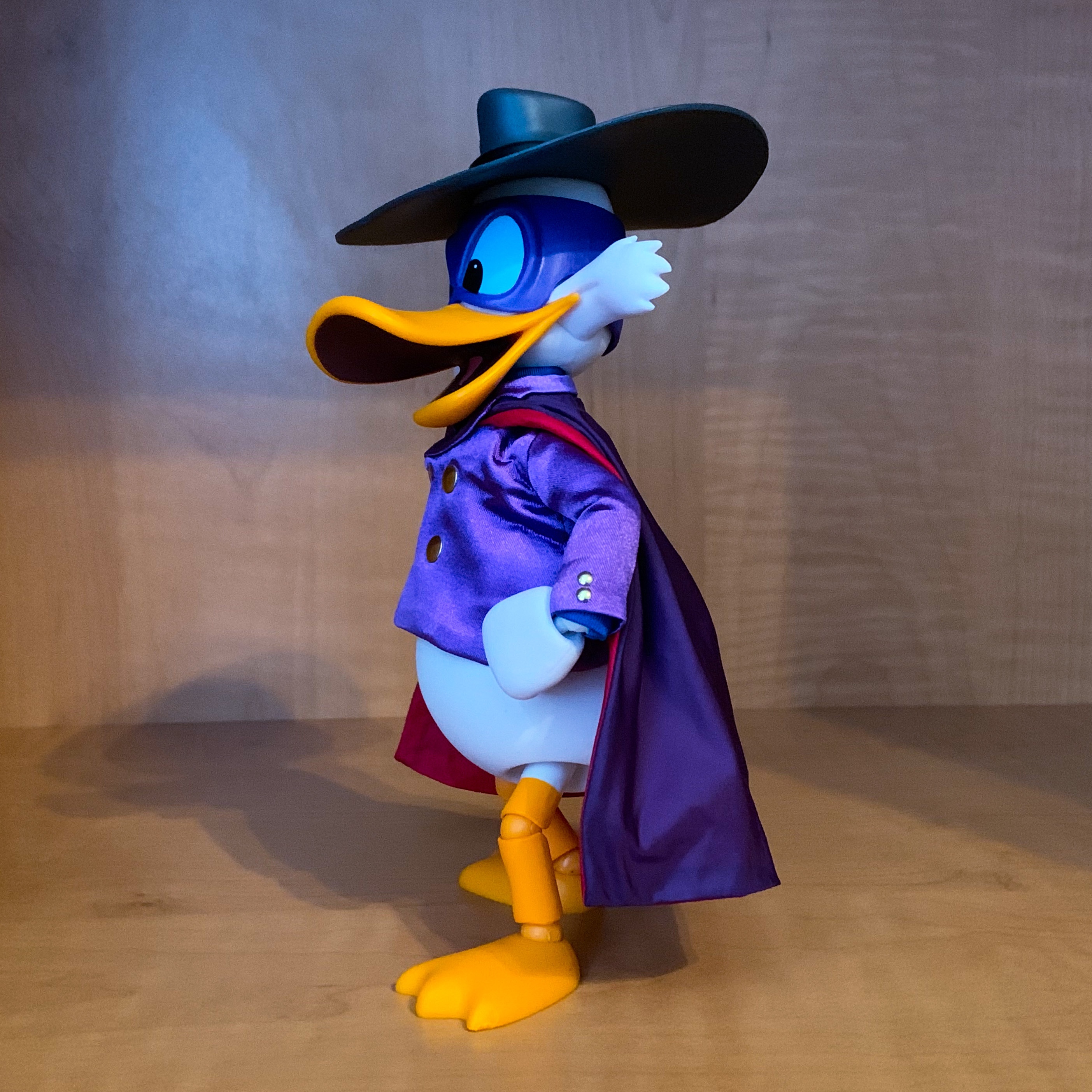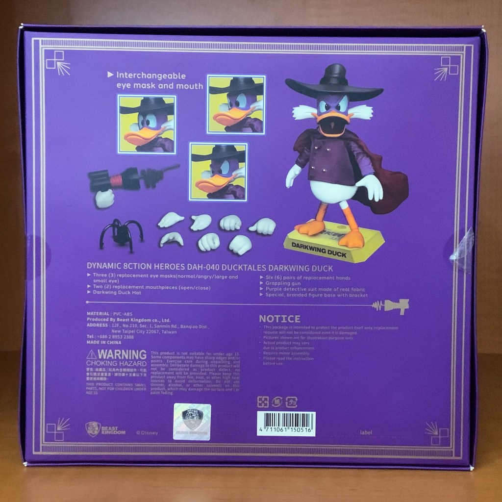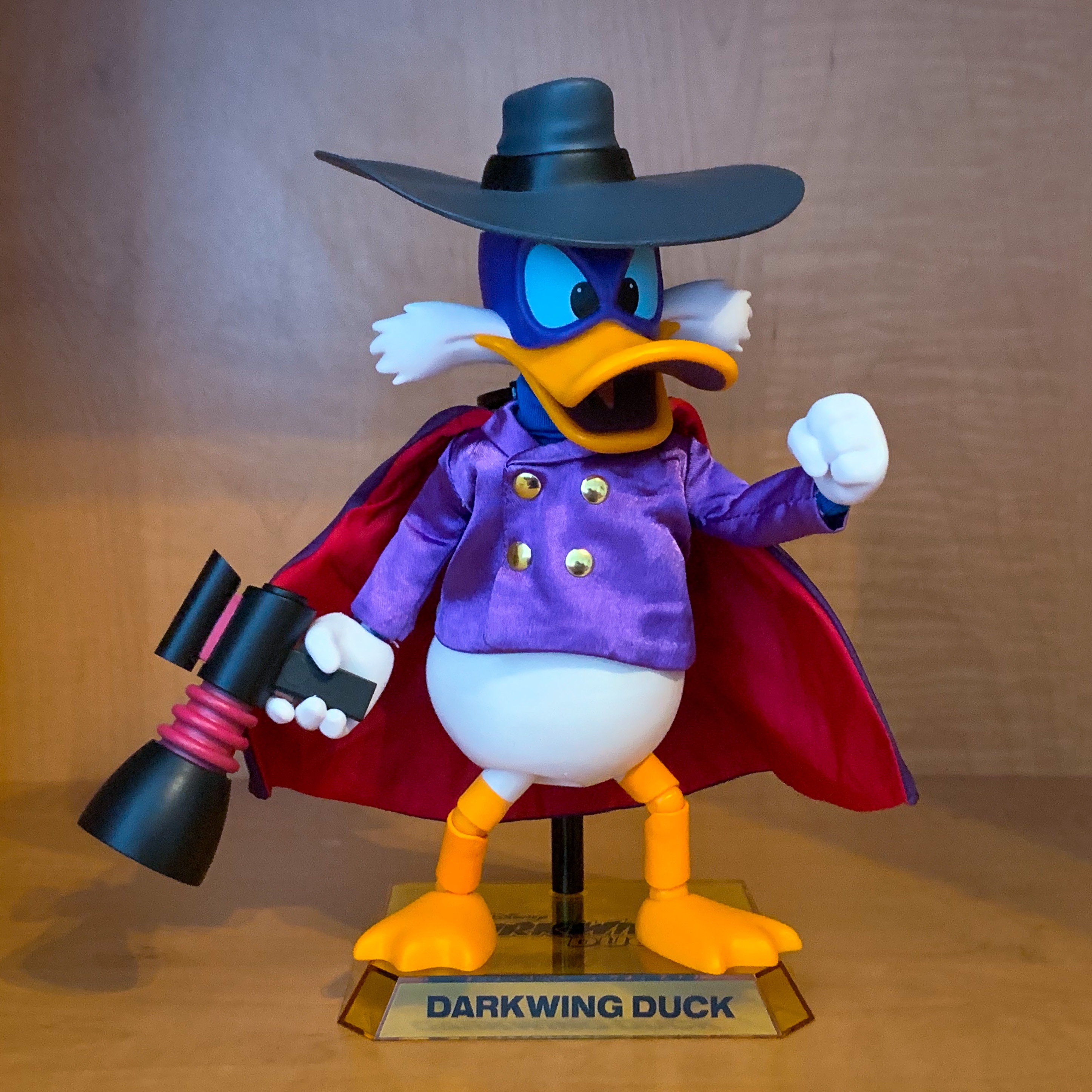 There have been other Darkwing Duck action figures released in the past, but this one really stands out. I was really hyped when this figure was first announced and revealed, but it looks even better in person and exceeded my expectations. It is a dangerous dream come true to have my favorite Disney character in 1/9th scale size with such great articulation and customizations to pose in my Darkwing Duck collection. I love the alternate eyes/mask, beaks, and hands accessories. I am thrilled that Beast Kingdom also chose to release a Negaduck figure in their Dynamic 8ction Heroes figure line. This gives me hope that other characters from the show could get released if Darkwing and Negaduck sells well. I would love to see Beast Kingdom expand on this collection with Launchpad McQuack, Gosalyn Mallard, Bushroot, Megavolt, Liquidator, and Quackerjack. Get dangerous and get this amazing Darkwing Duck figure!