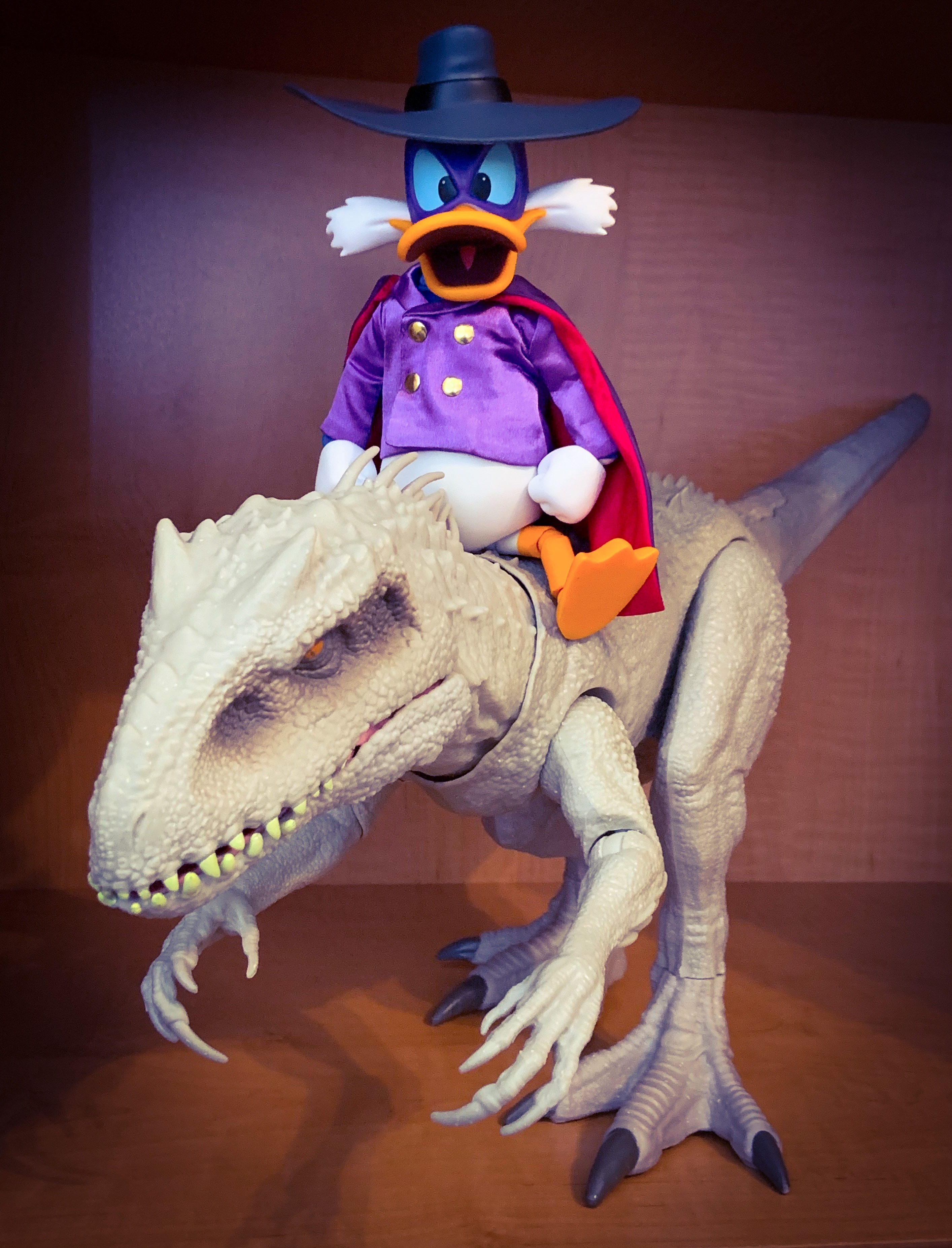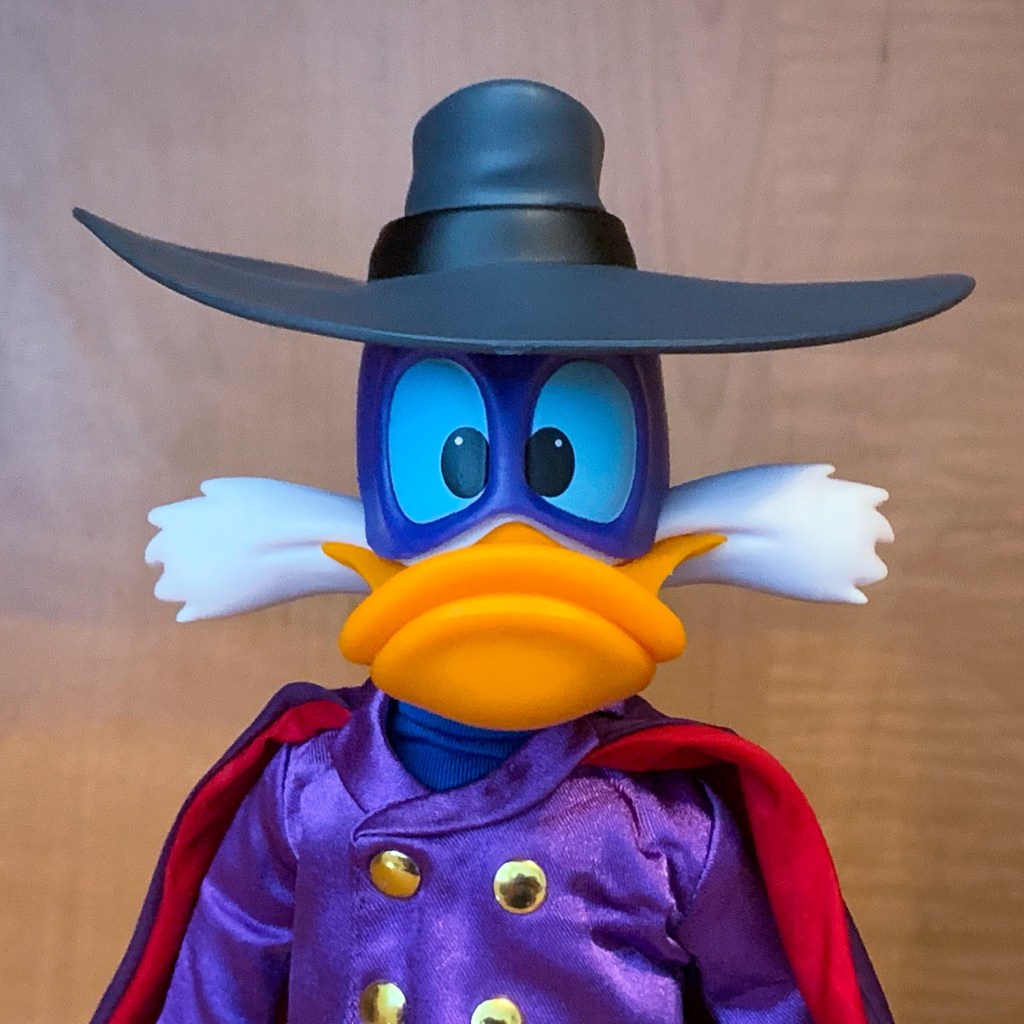 The Canardian Guardian stands at 6.5 inches tall and looks even better in person than in the original promotional photos. The coloring of his hat is dark gray as opposed to light gray like in the show. DW is also a little more rounder, but that definitely helps with the weight distribution of the figure for balancing purposes with your Darkwing display poses. The figure stands great on it’s own, and it is highly articulated for ultimate possibilities with your Darkwing posing.