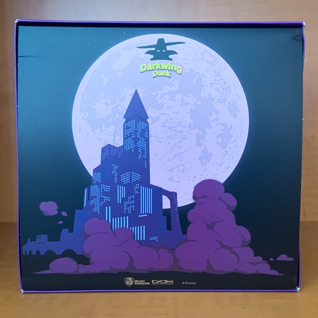 The inside flap of the box features the Darkwing Duck silhouette logo from DuckTales (2017) as well as a giant moon, smoke, and St. Canard skyline inspired by the DuckTales (2017) animation style.