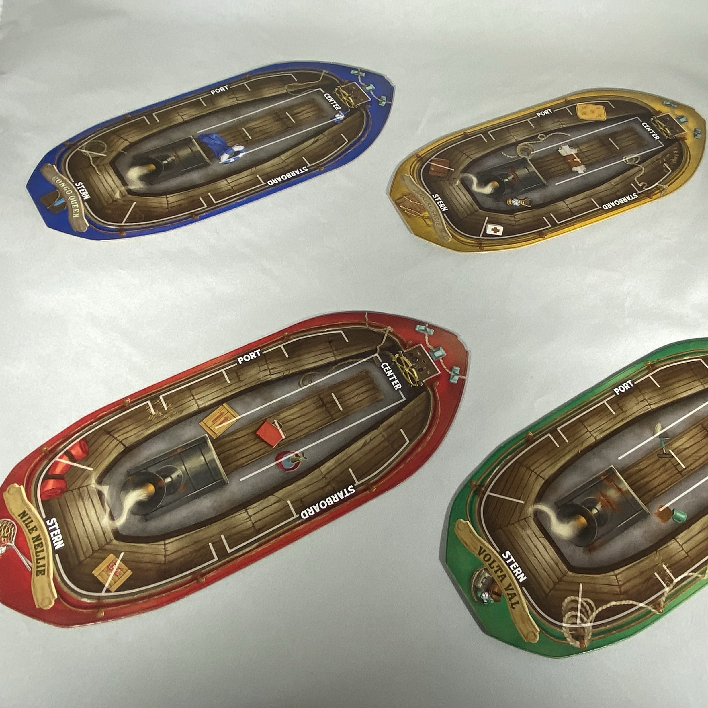 The Boat Movers are plastic and they are detailed perfectly for the game. Each player also has their own Boat placard that allows them to organize and strategize the placement of their cargo. The goal is to navigate the river quickly, collecting cargo and passengers. Some travelers are more important that mothers, and your final score (pay day) is determined by the cargo that you deliver.