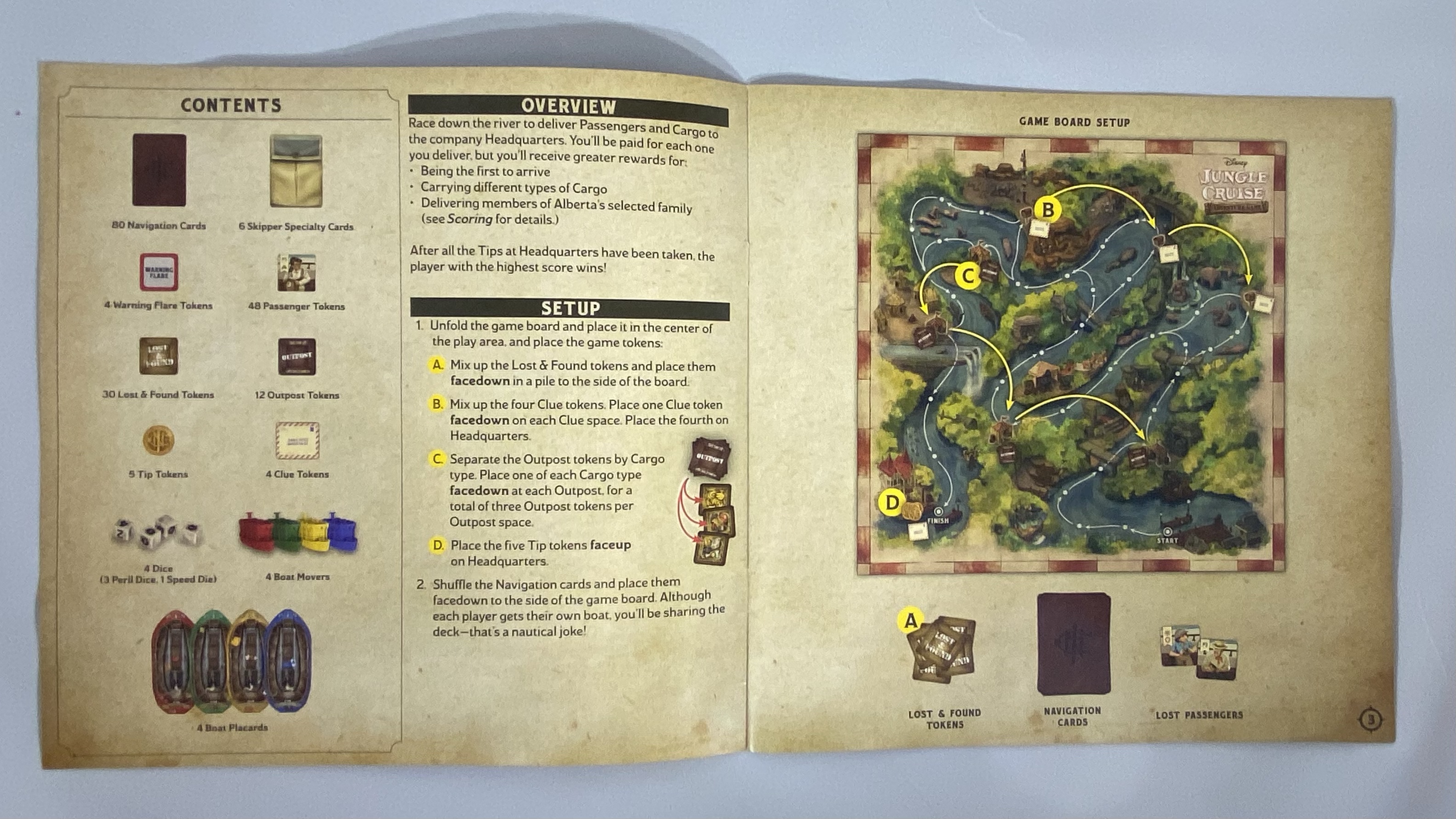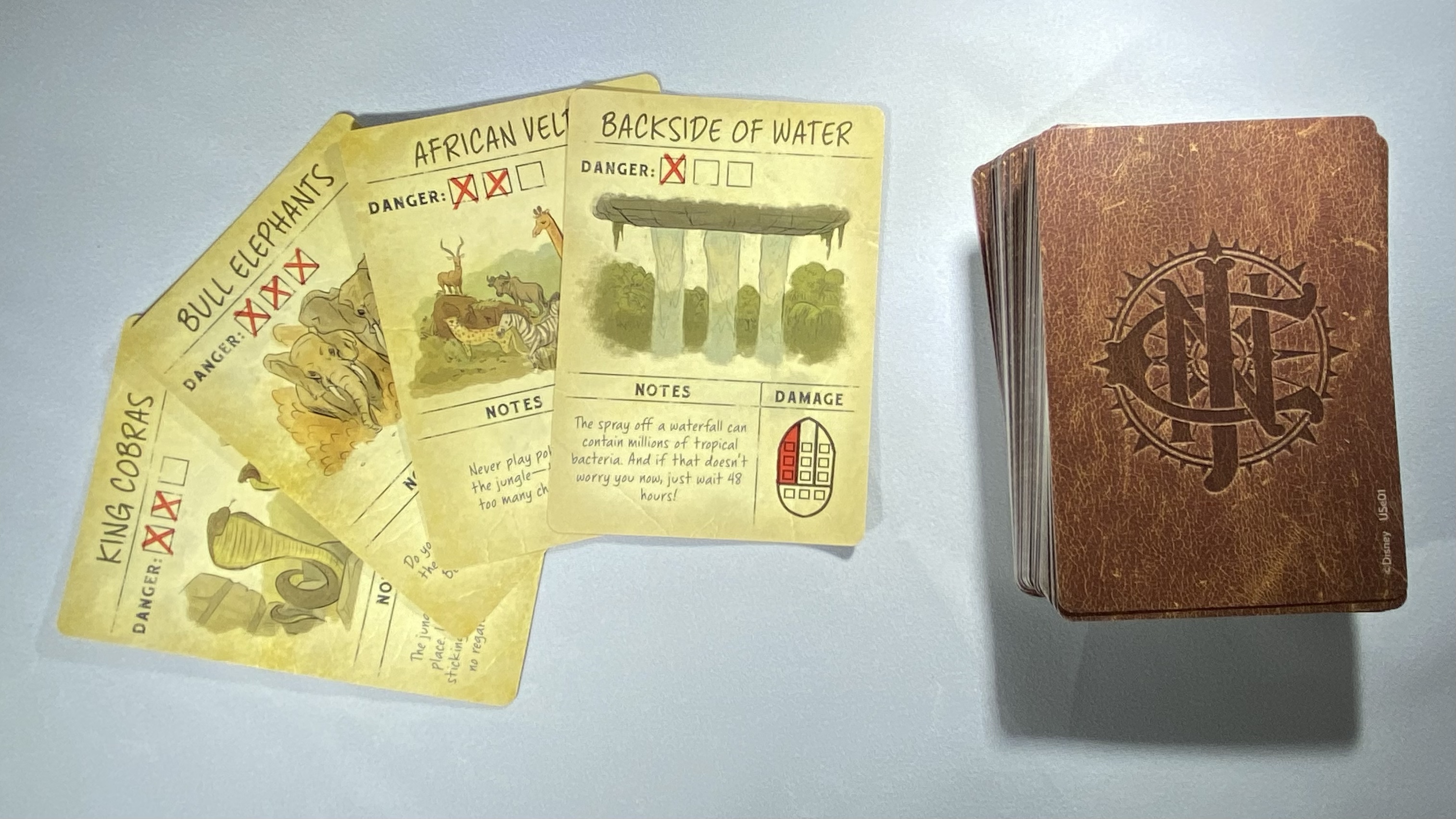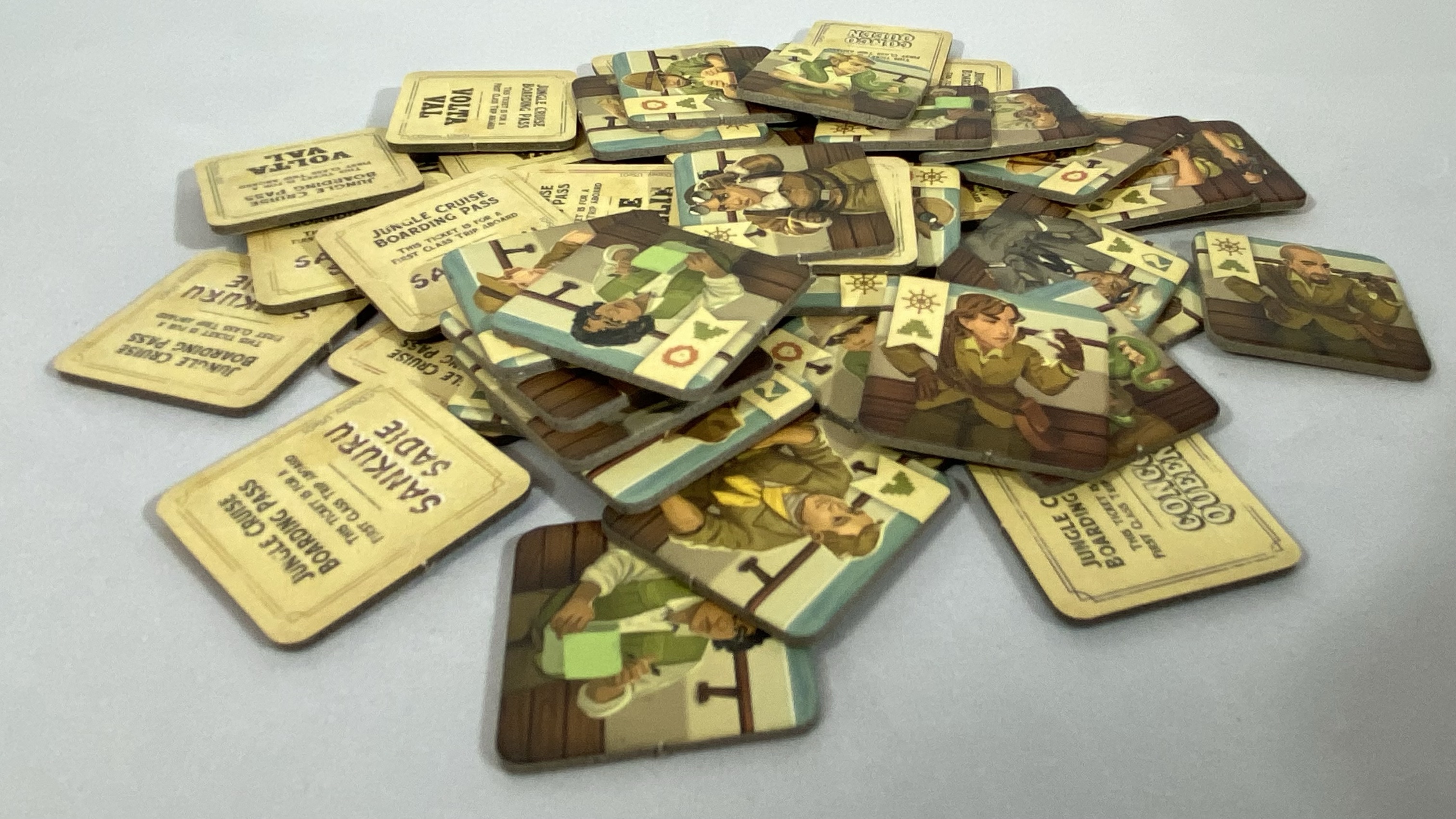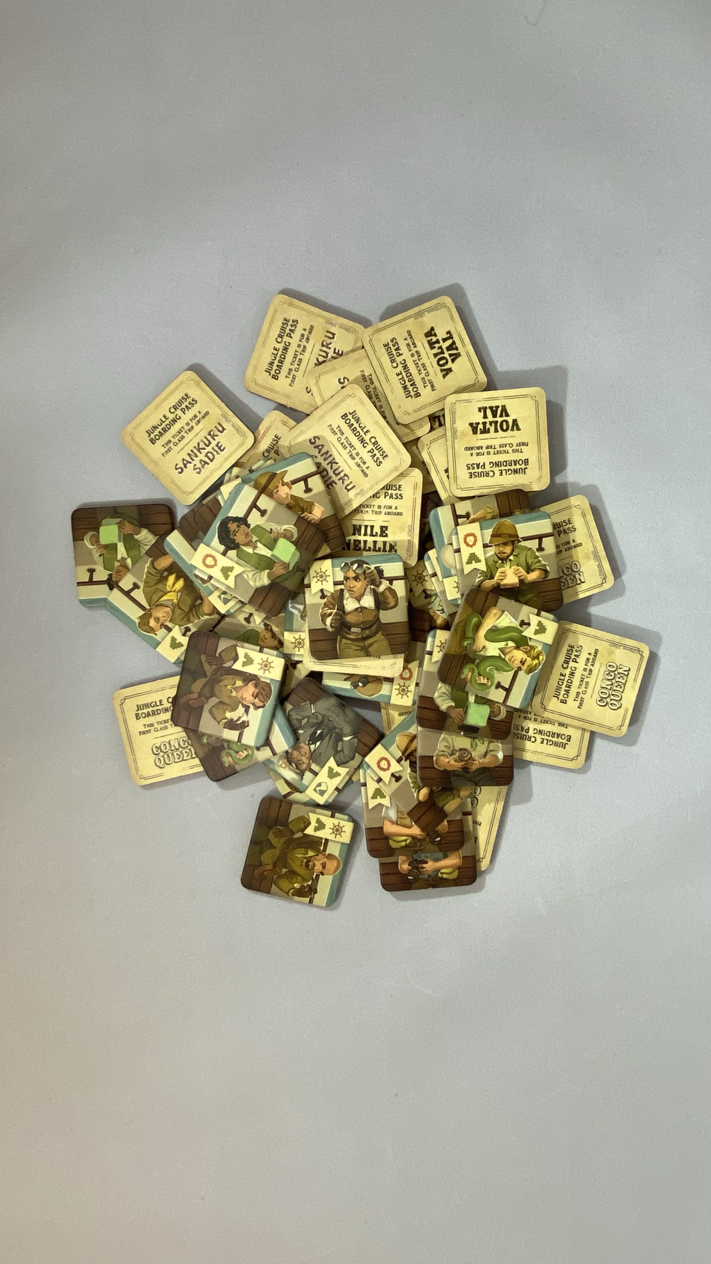 The Navigation cards determine what dangers and fortunes your cruise will experience. Every turn is filled with treachery and obstacles that can cost you cargo and passengers. The cards reference familiar sights on the Jungle Cruise attractions, with some punny jokes. Of course telling the jokes properly is part of the fun, and adds another level of enjoyment to the play.