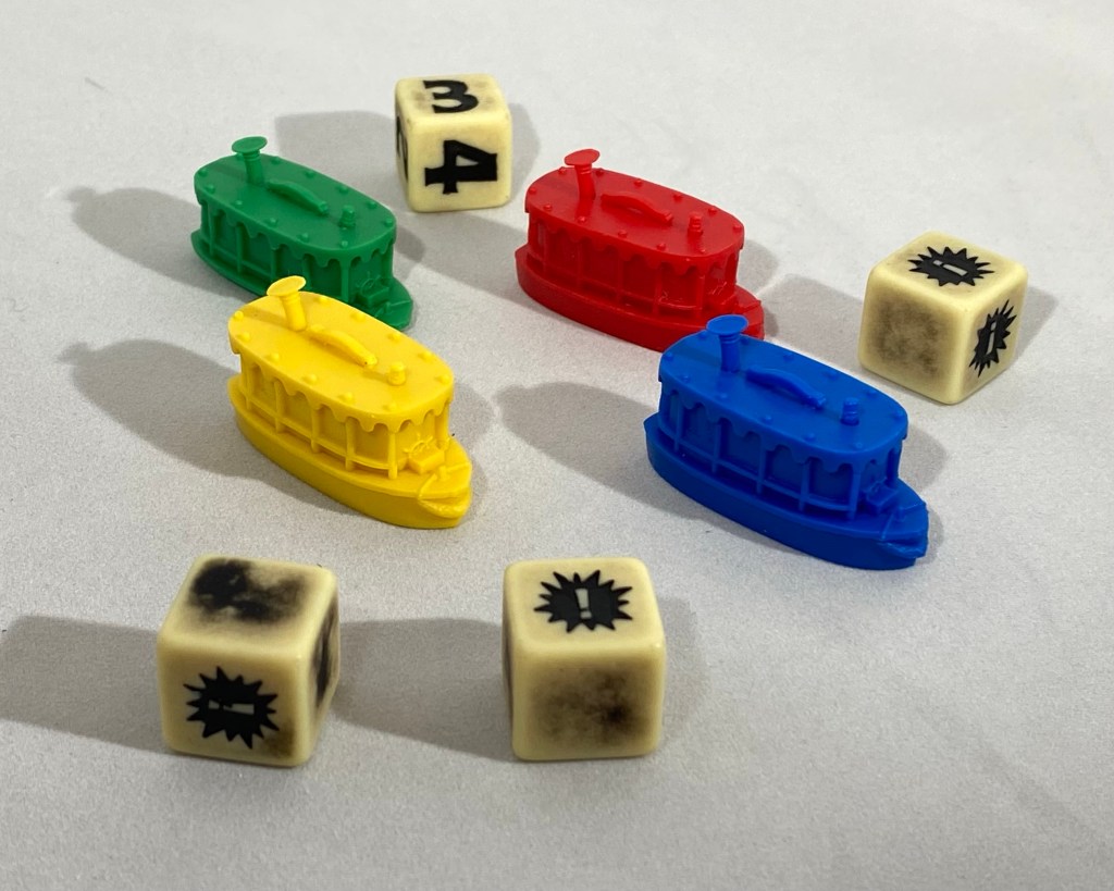 The box contains a game board, 80 Navigation cards, 4 Dice, 4 Boat movers, 4 Boat placards, 6 Skipper Specialty cards, 4 Warning Flare tokens, 48 Passwnger tokens, 30 Lost & Found tokens, 4 Club tokens, 12 Outpost tokens, 5 Tip tokens, and a Rulebook.
