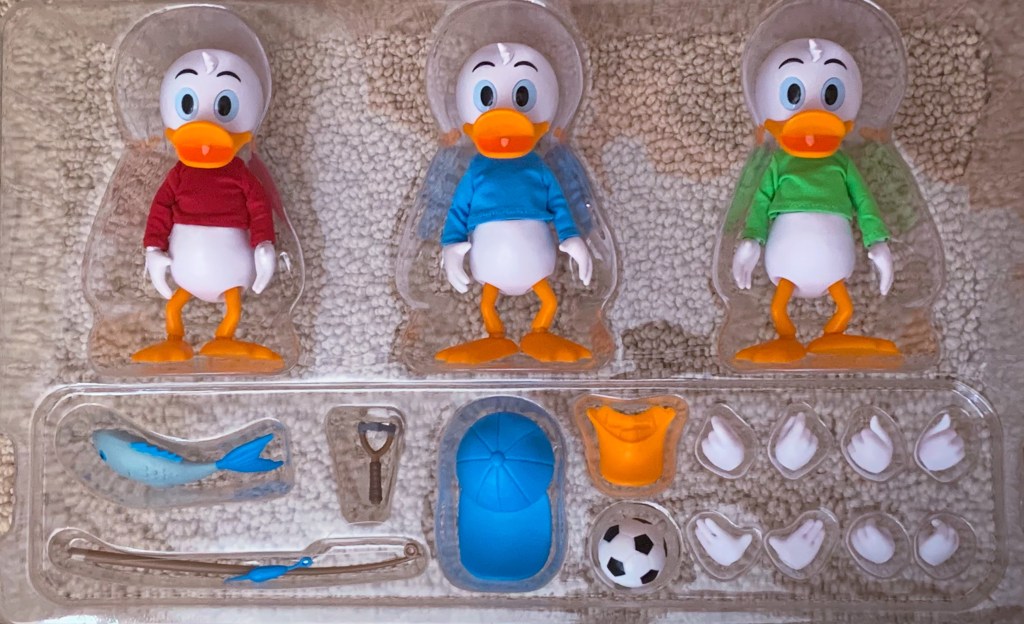 The Beast Kingdom Huey, Dewey, and Louie (DAH-069) figure set comes with a few accessories and an assortment of alternate parts that will give you plenty of options to customize your Huey, Dewey, and Louie figures in your display. The pegs on their hands are a tight fit for hand swaps. So be patient and careful.