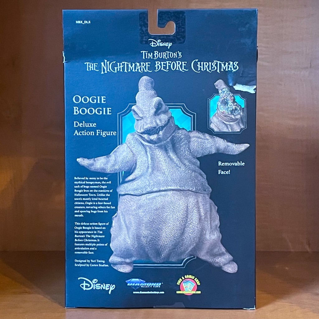 Oogie has two distinct looks in The Nightmare Before Christmas. The brown burlap sack is his normal look that is depicted with this figure release. His other look is his burlap sack in neon green from the black lights in his lair. Diamond Select Toys released a limited edition SDCC exclusive boxed set that featured his neon green appearance. I would love to see that figure get an individual release.