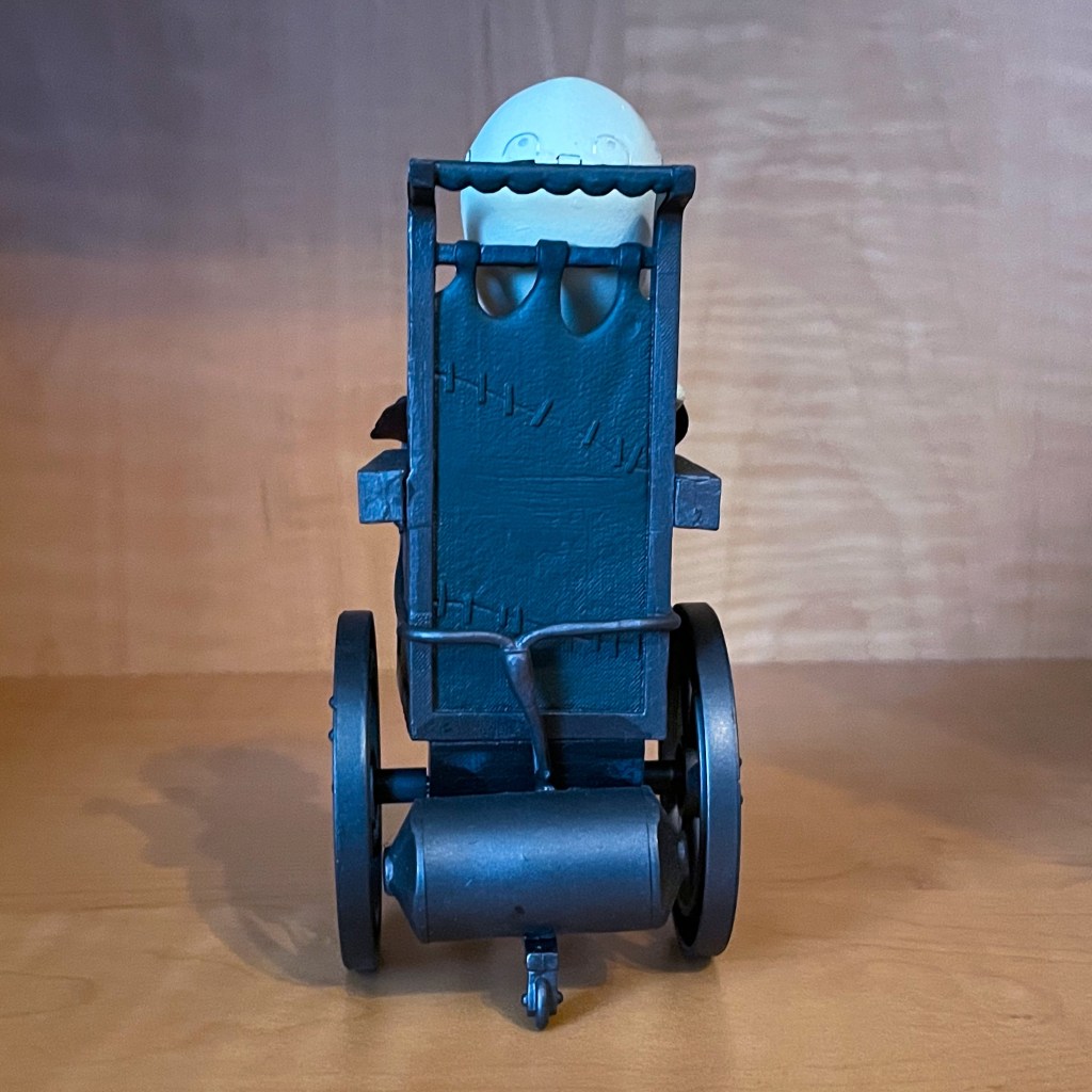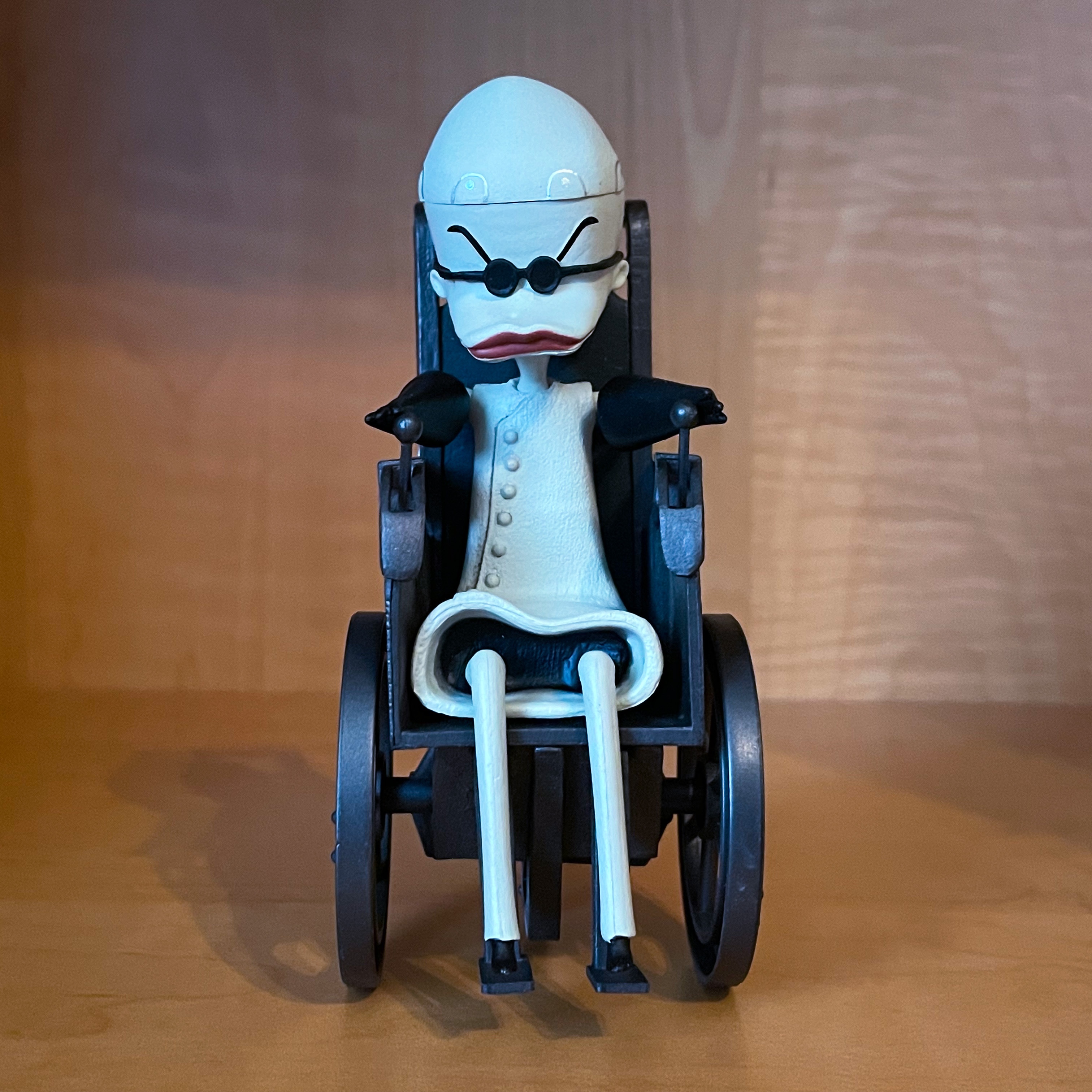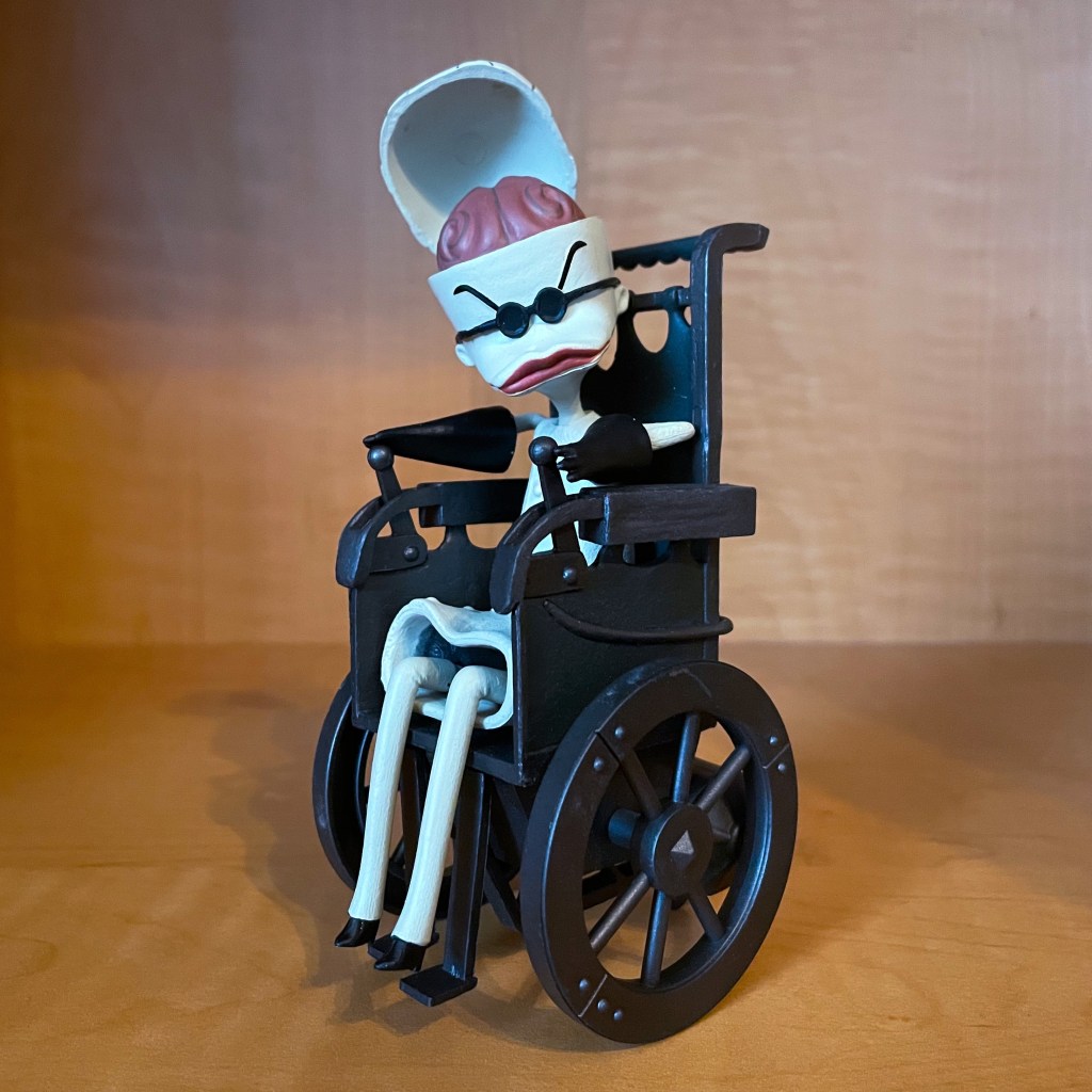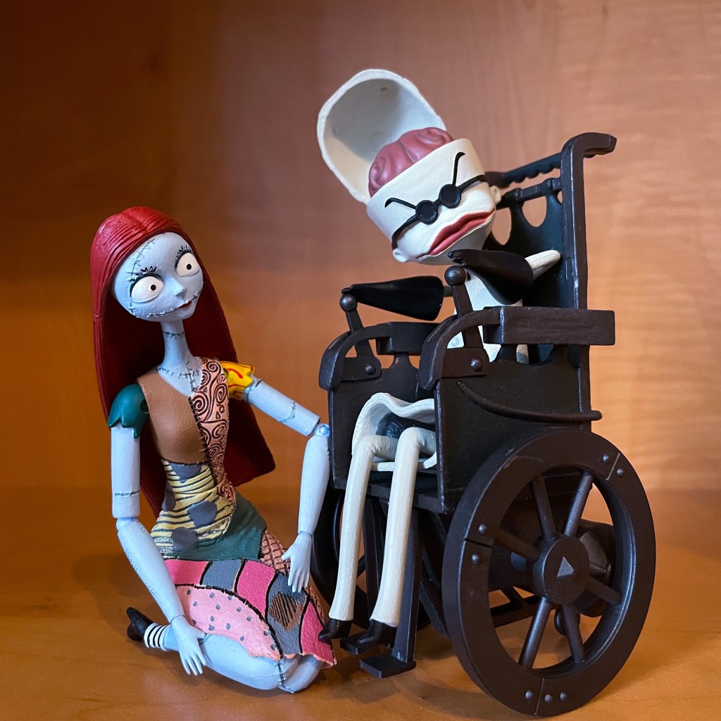 The brilliant doctor comes with his wheel chair. The wheels on the chair do actually move. Dr. Finkelstein has five points of articulation which includes his head, arms (2), and legs (2). He is not attached to the chair, but he is permanently molded into a seated position. Dr. Finkelstein is in the chair the whole movie except for when the wheel chair falls over in a scene.